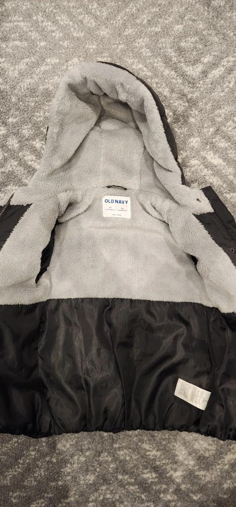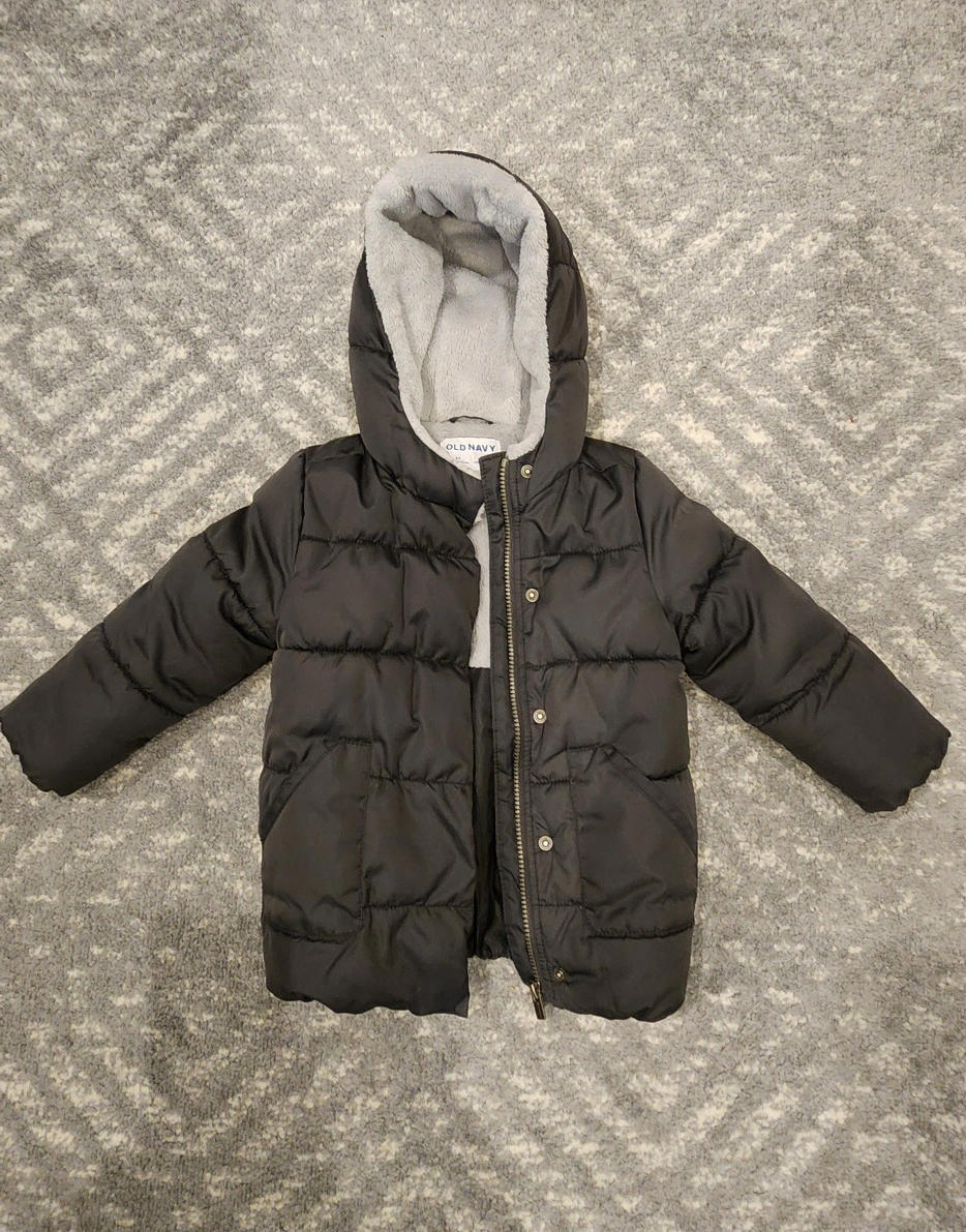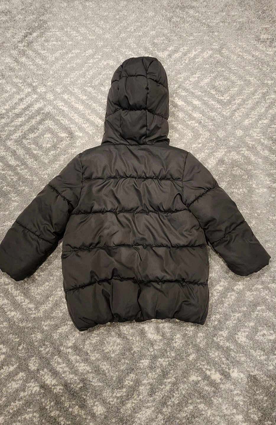 Slate/dark grey hooded puffer jacket with soft lining. Features a zipper and button closure, two front pockets, and a hood.