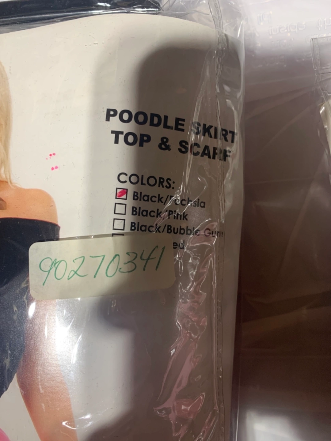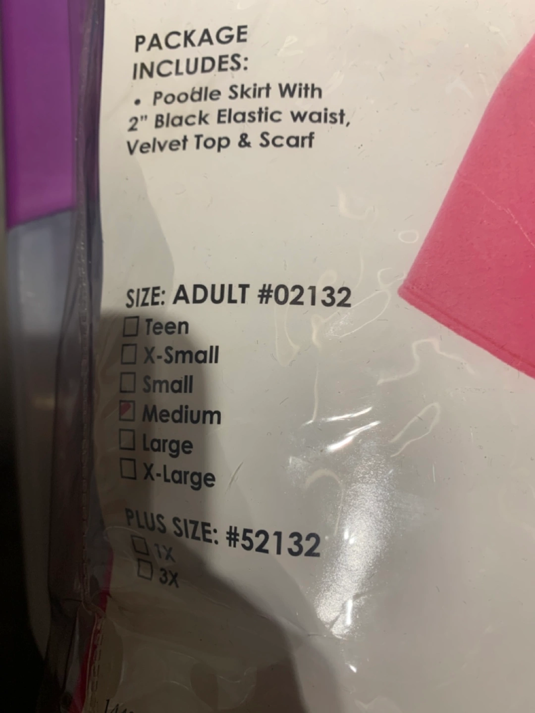 Poodle skirt costume, includes skirt, top, and scarf. Size Medium.
