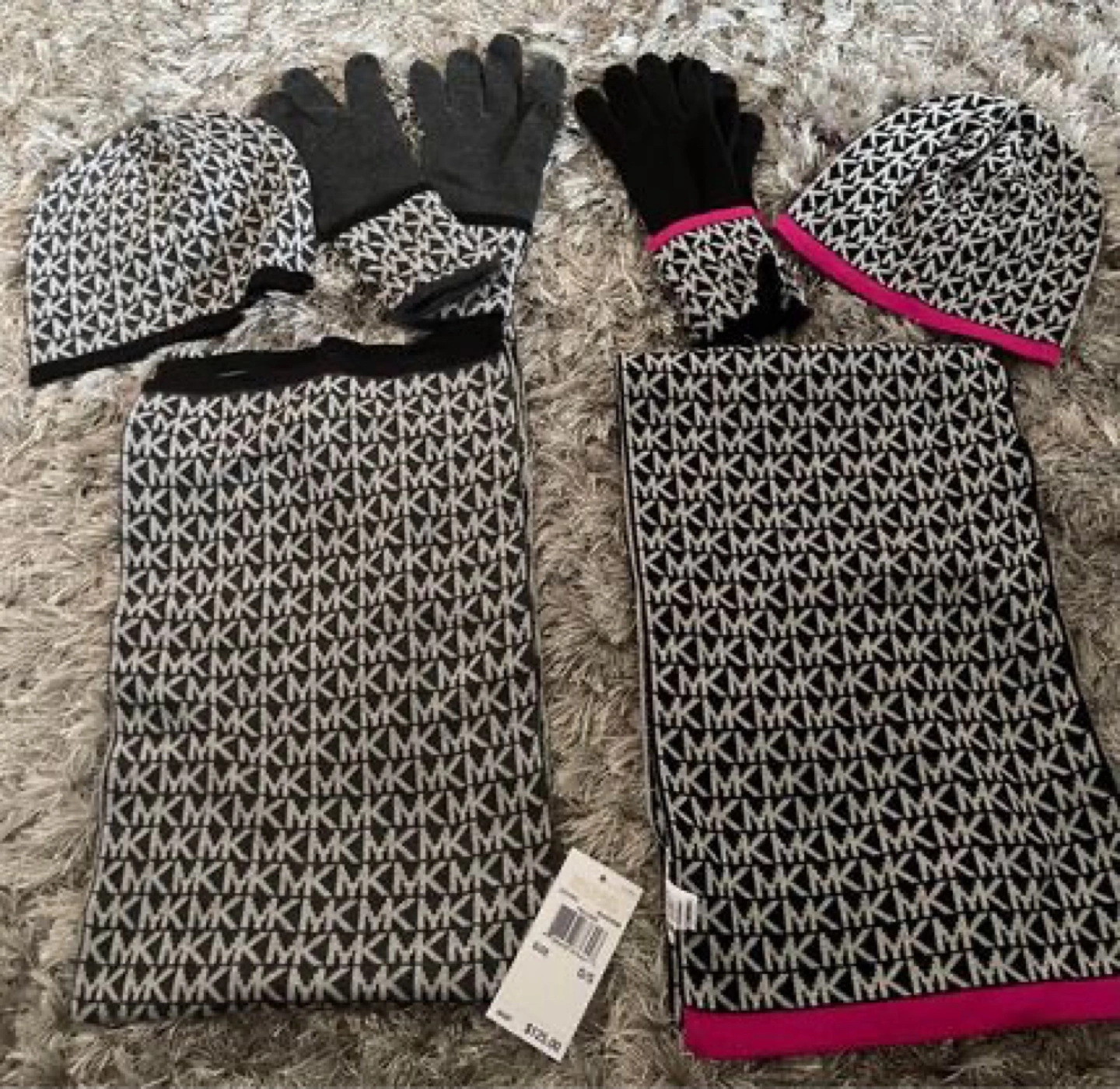 Black and white knit scarf and hat with pink trim, and a pair of black gloves. All items feature the Michael Kors signature MK logo.