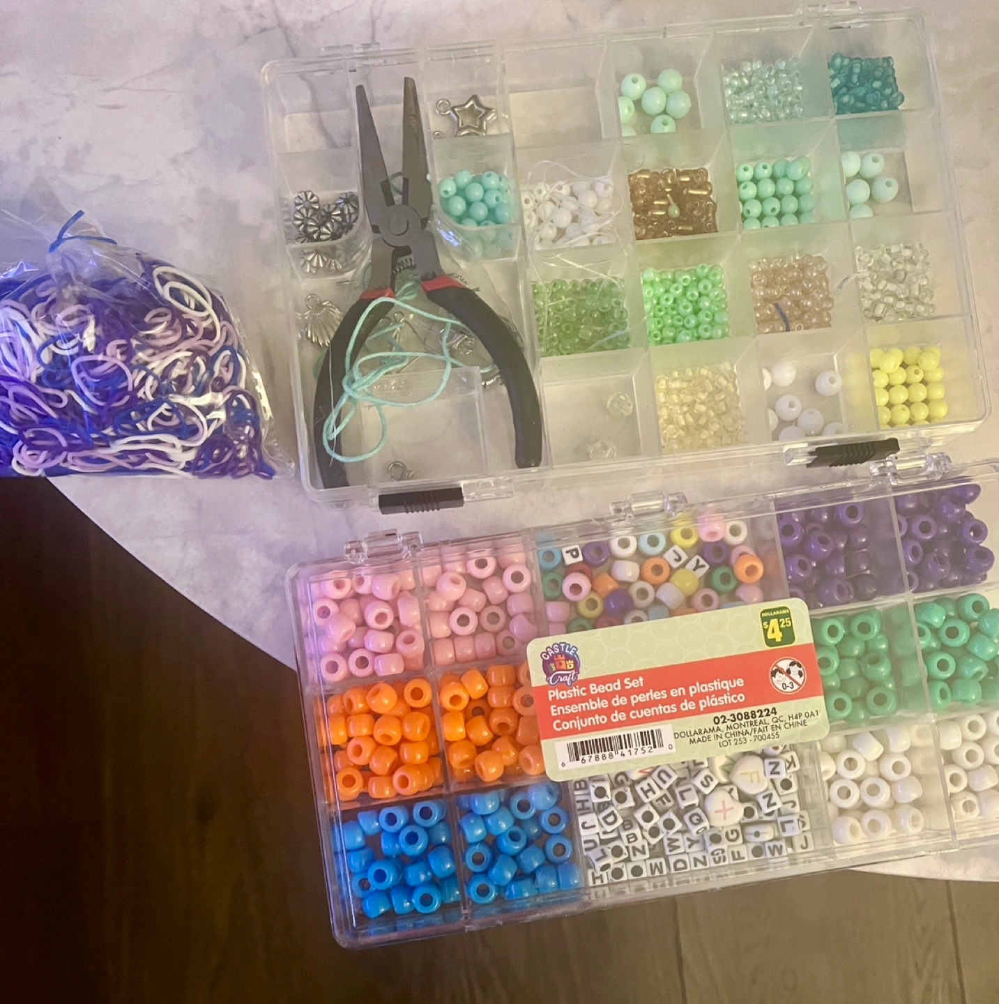 Kit includes pliers, elastics, beads in multiple colours, letters, and shapes. Fastest pickup preferred.