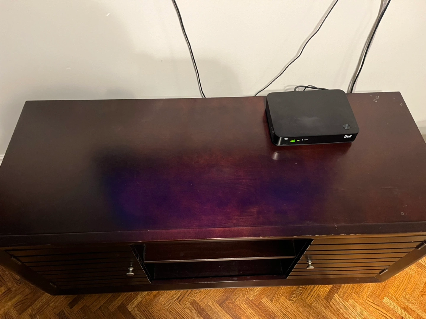 TV stand with two doors and a shelf. Good condition. Needs two small clips to hold up the shelves in the cupboards.
