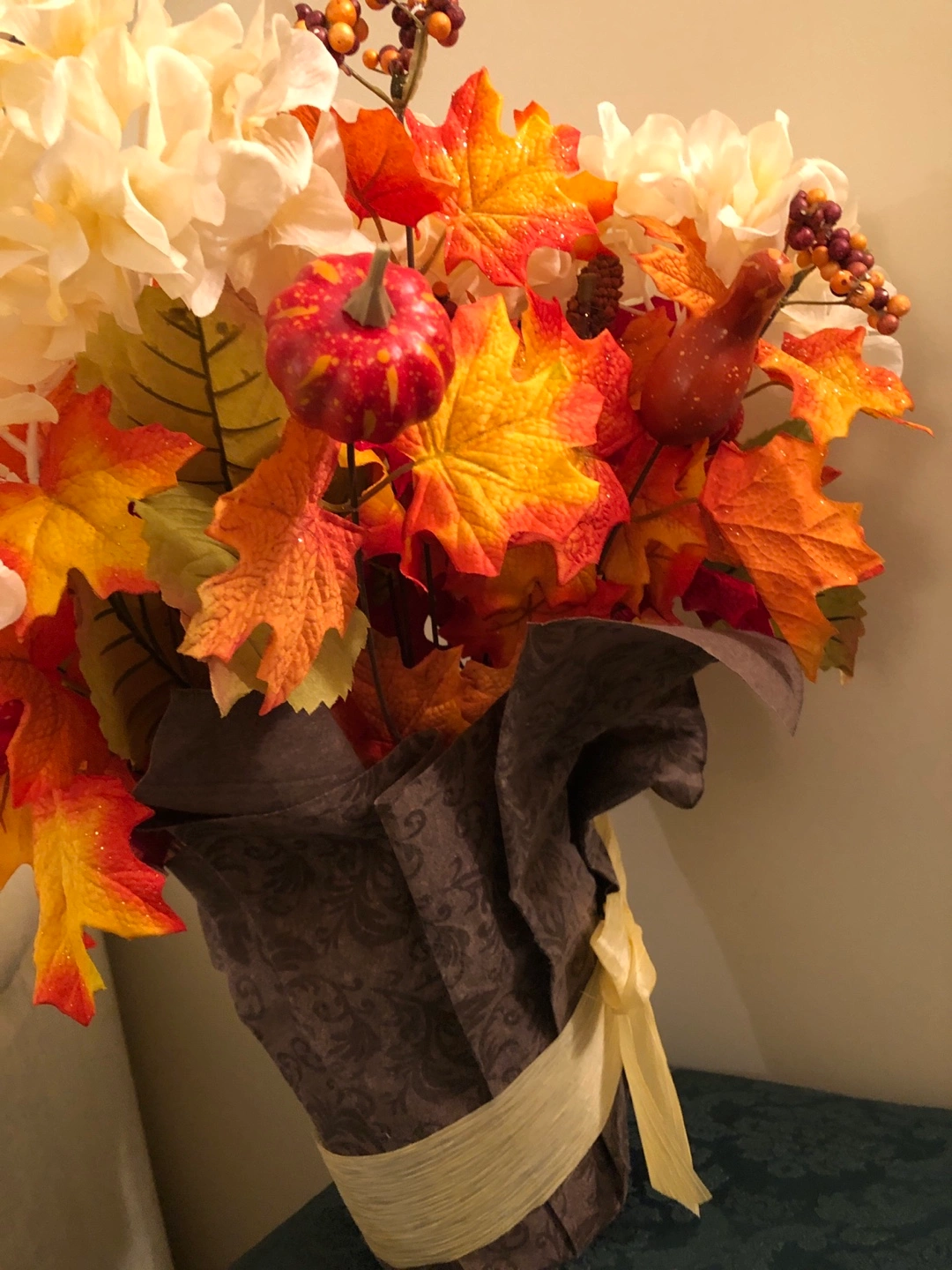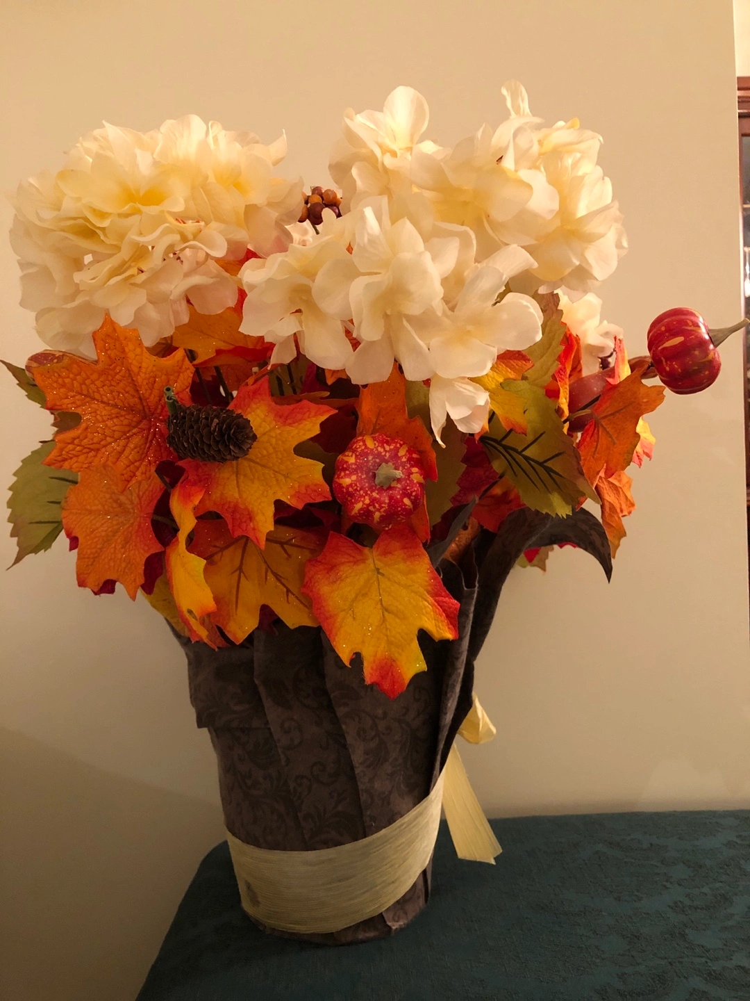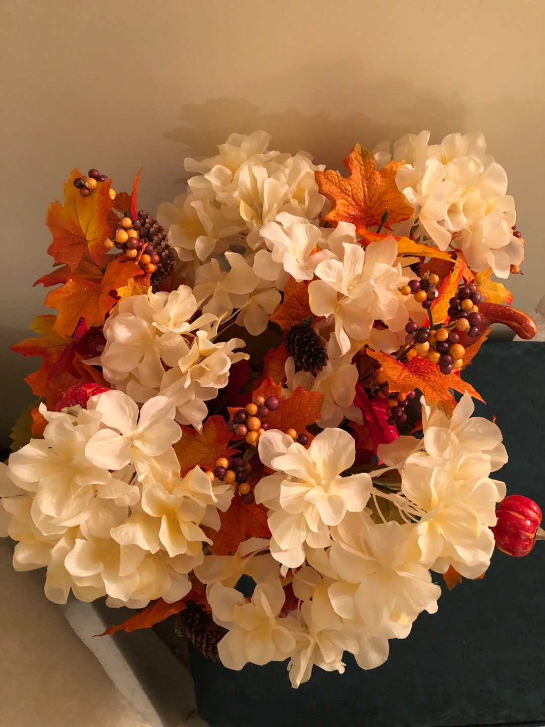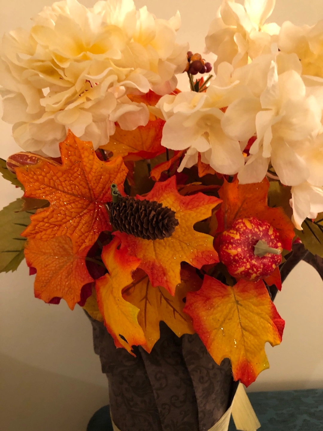 Fall themed artificial floral arrangement. Features white flowers, orange and yellow leaves, pine cones and mini pumpkins. The arrangement is in a brown pot with a cream coloured ribbon.