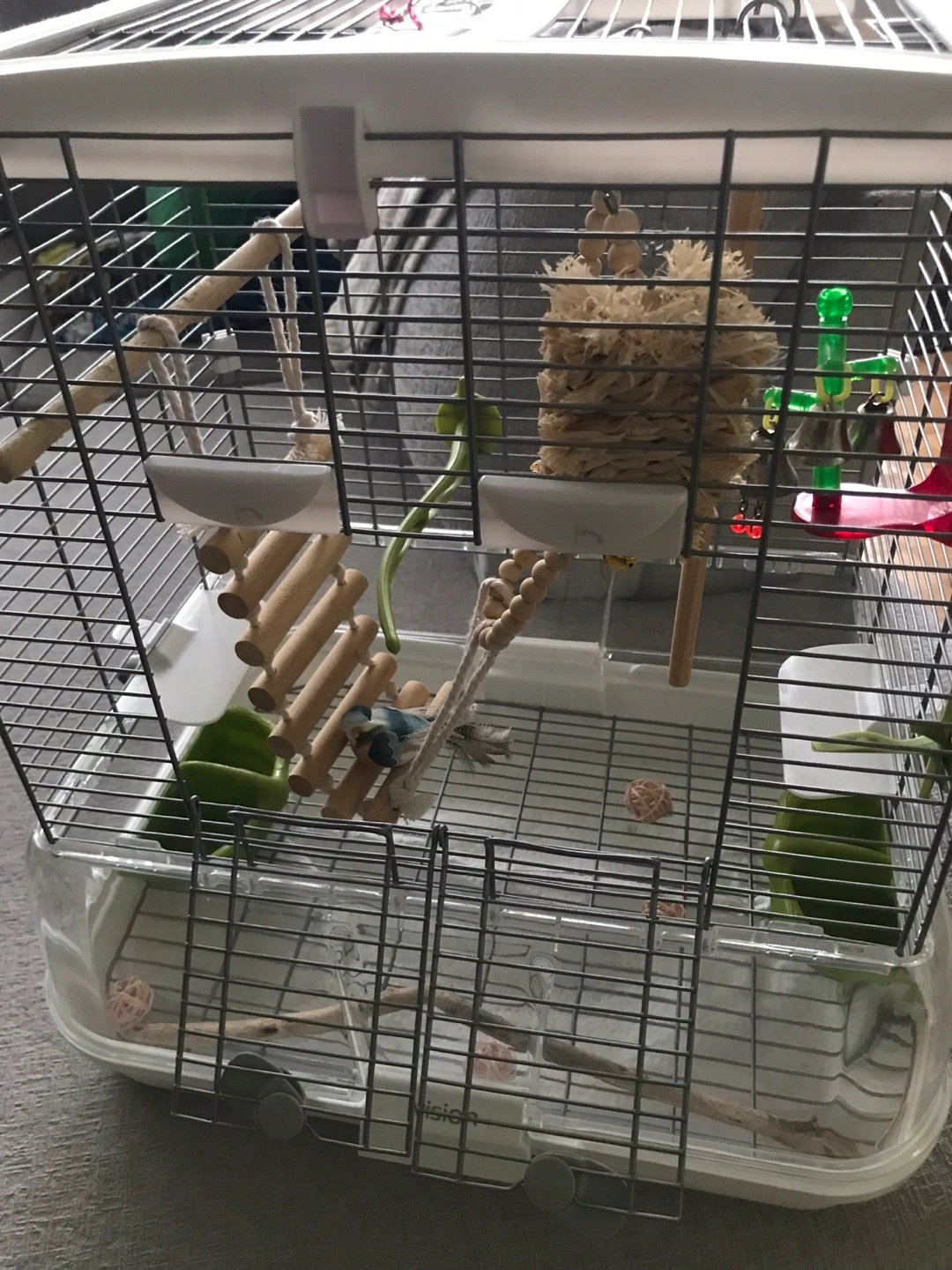 Bird cage with multiple perches and toys. Includes a food dish and water dish. Bottom tray is removable and easy to clean. Real price on Amazon’s $ 133 without the toys.