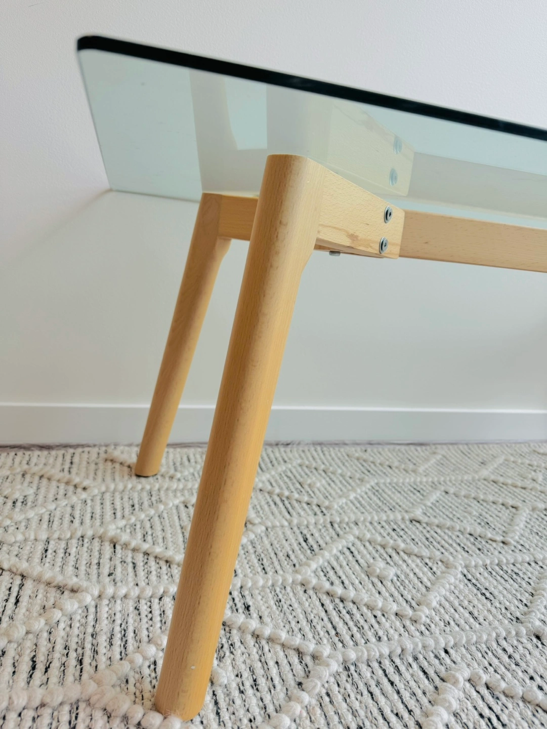 Glass coffee table with wooden legs. The table has a clear glass top and a wooden frame. The legs are made of a light-coloured cedar wood.