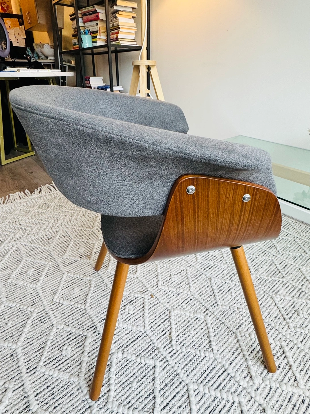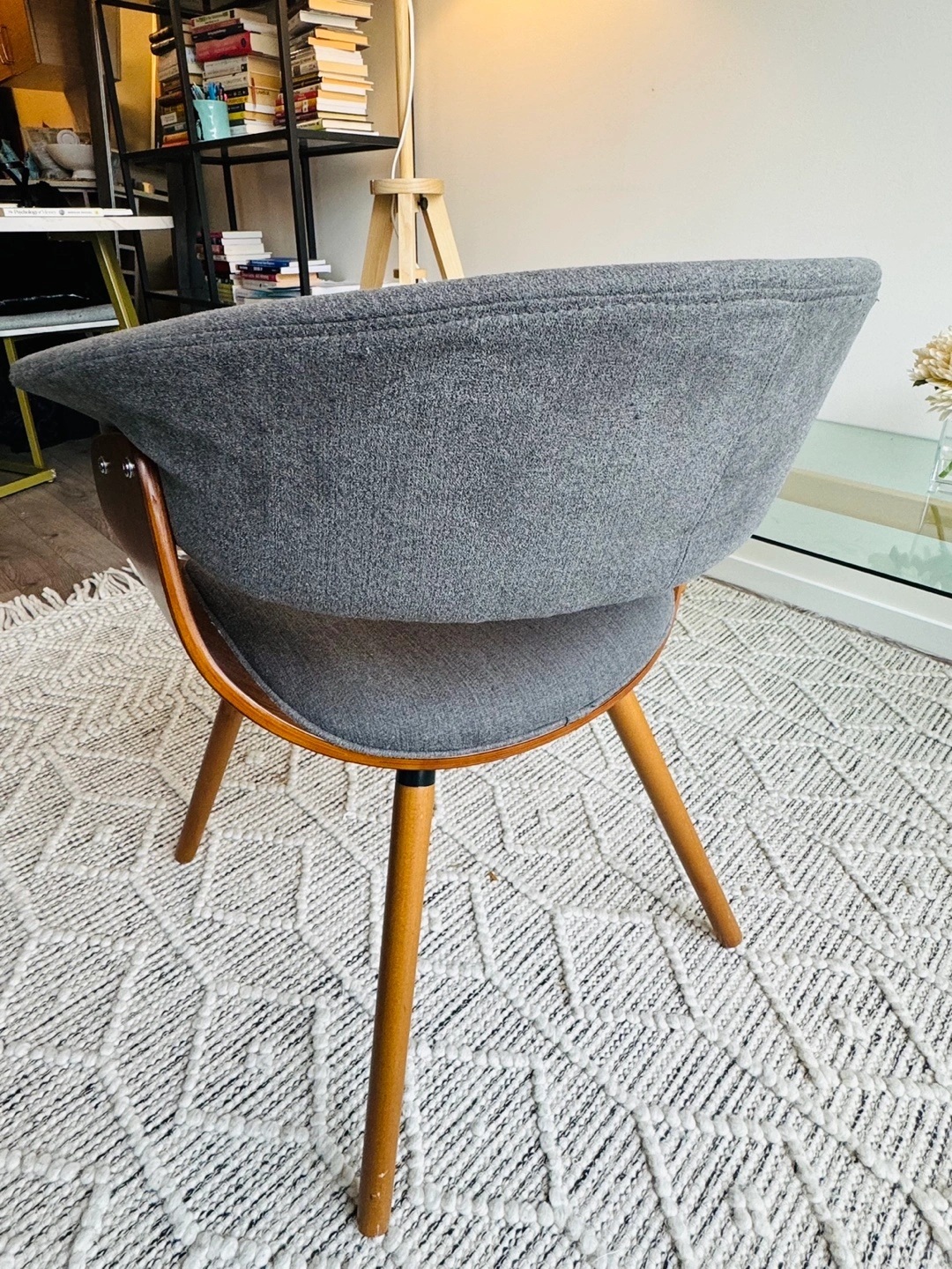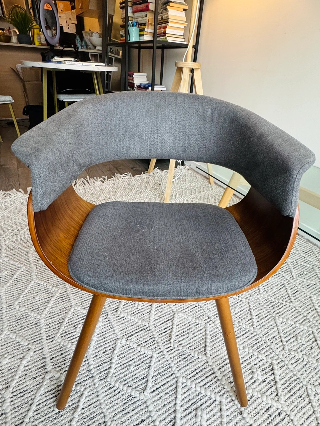 Grey fabric chair with wooden legs and a curved back. The seat is slightly curved.