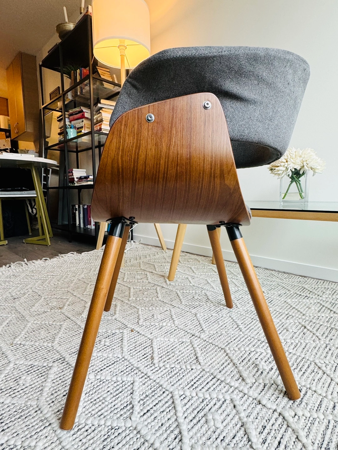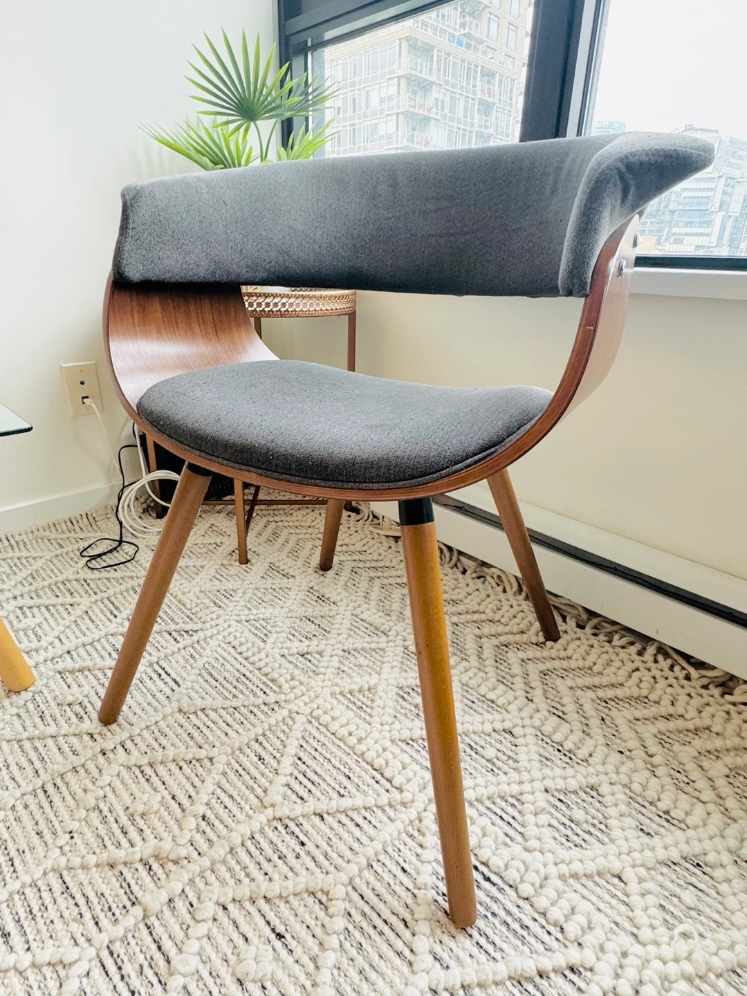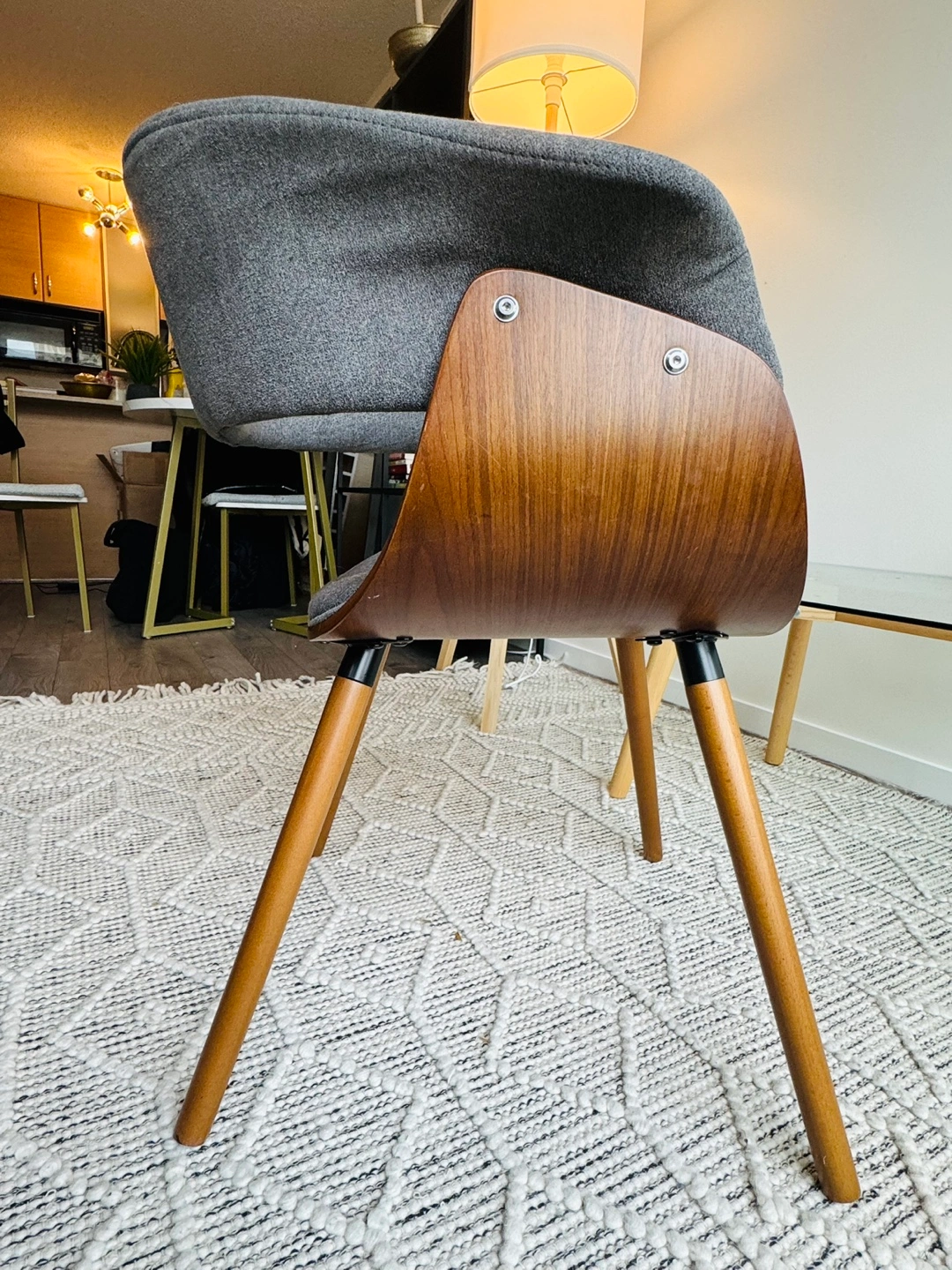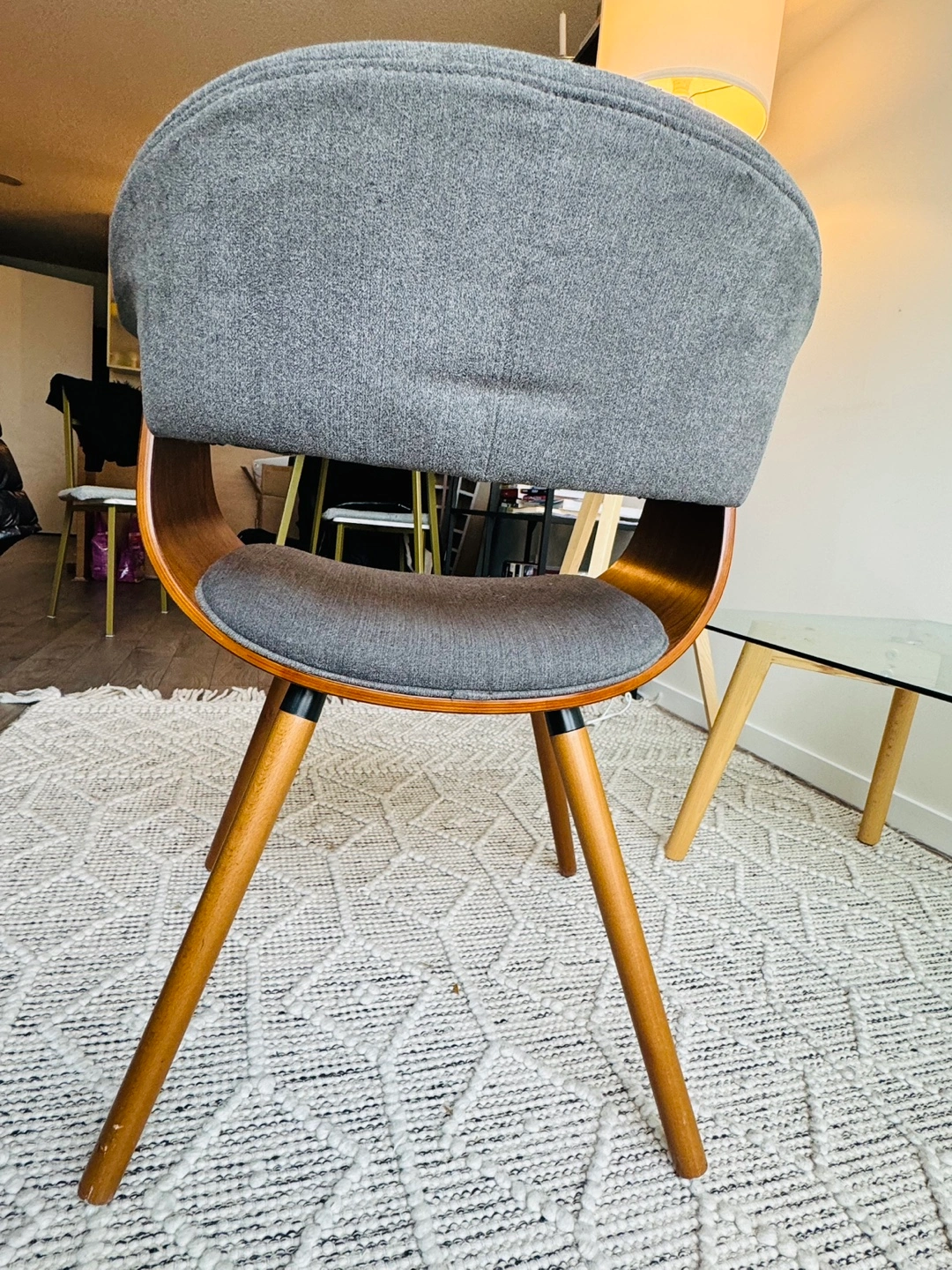 Grey fabric chair with wooden legs and a curved back. The seat is slightly curved.
