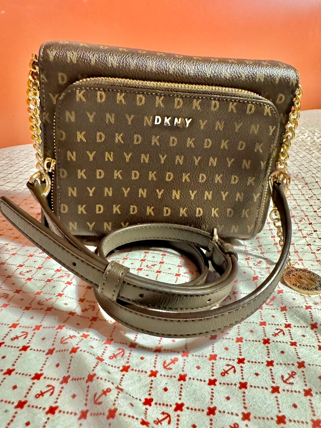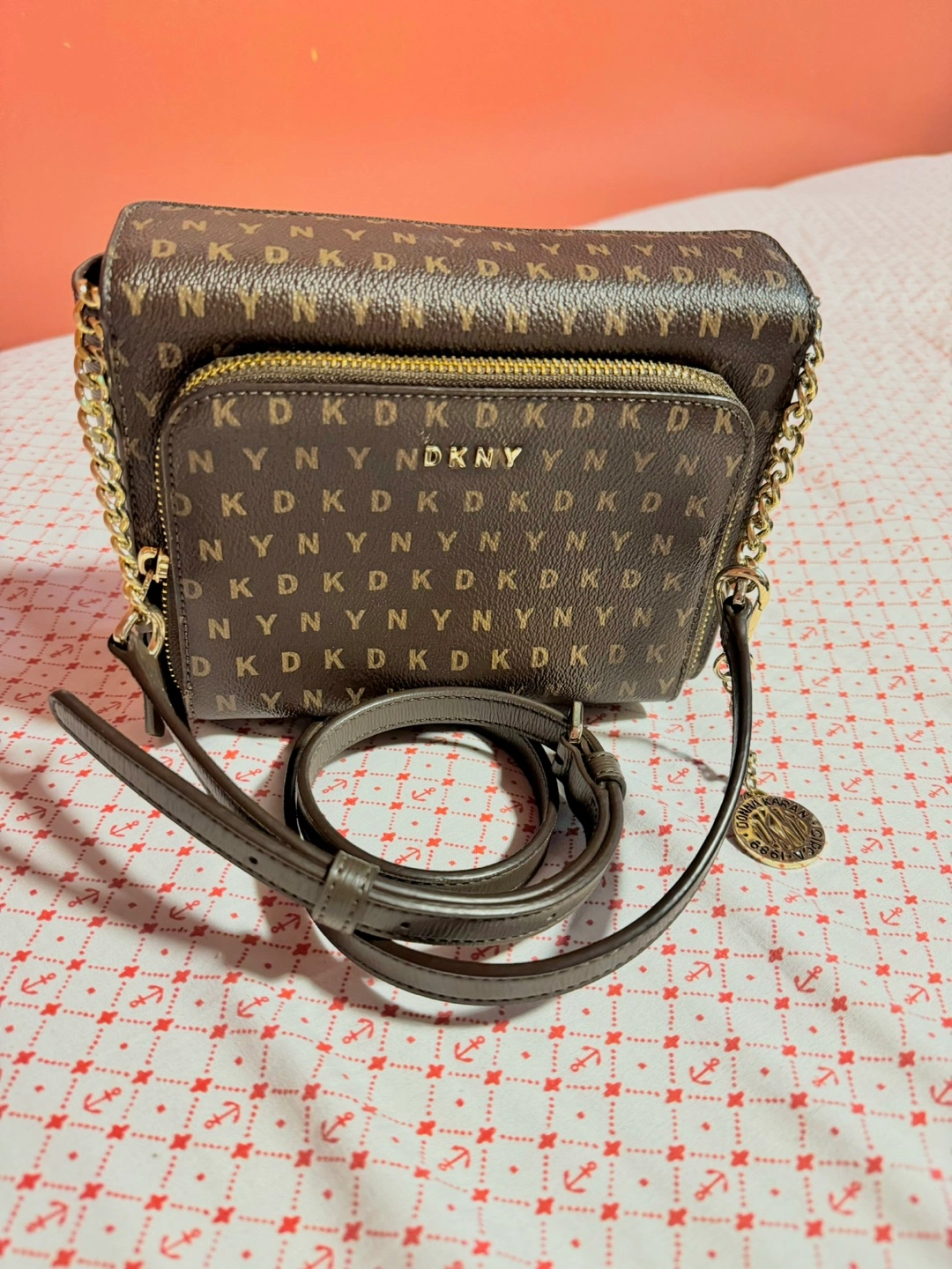 Small crossbody bag with a gold chain strap. Features a zipper closure and a small pocket on the front.