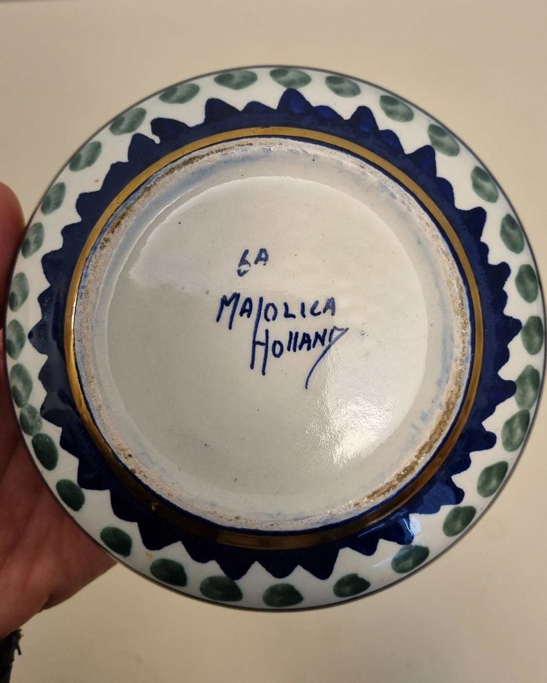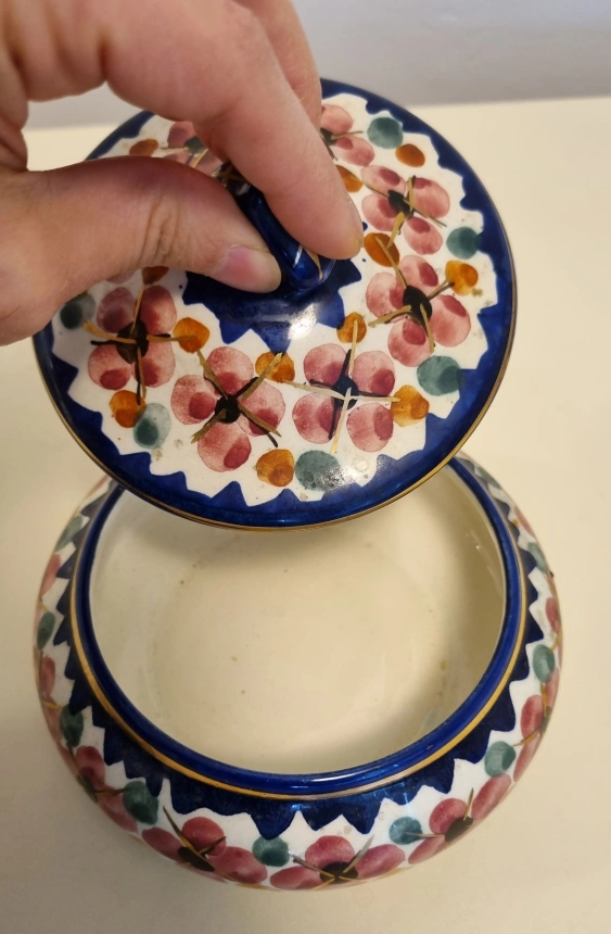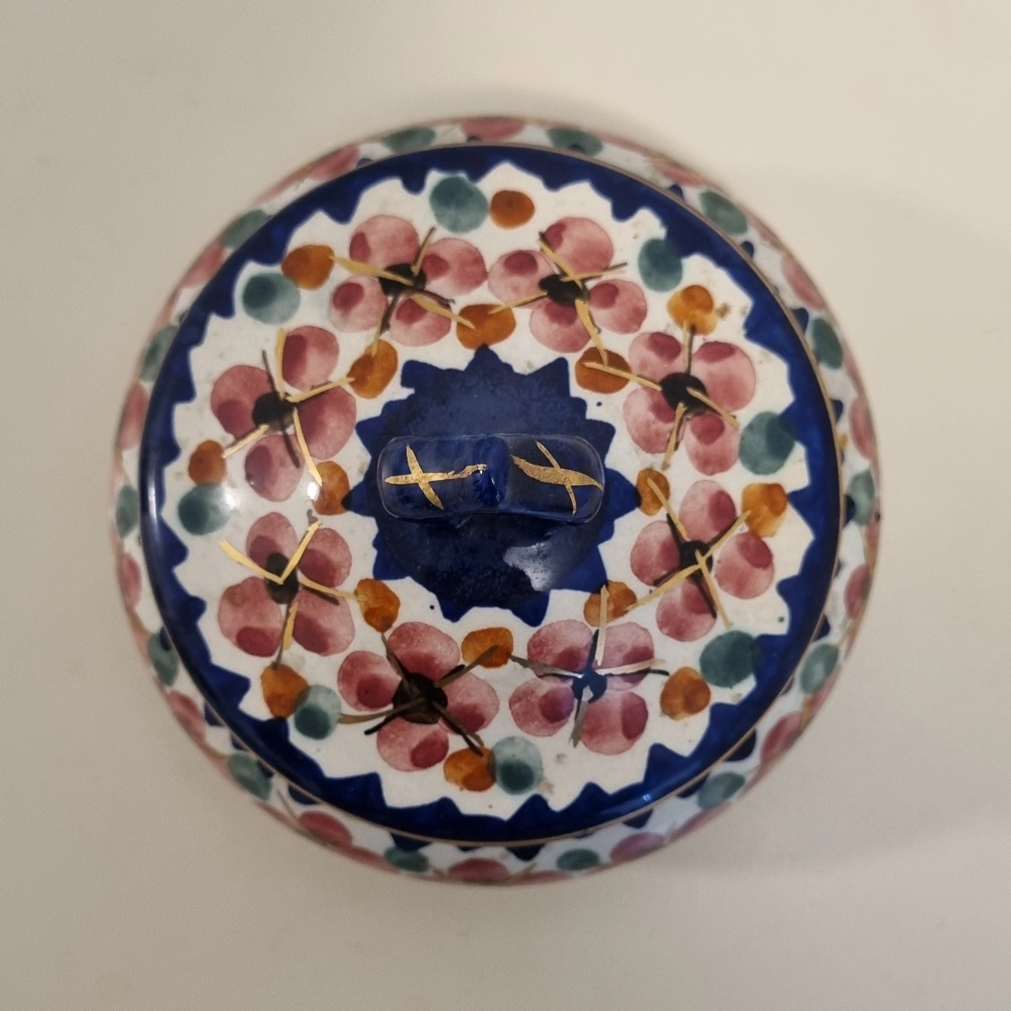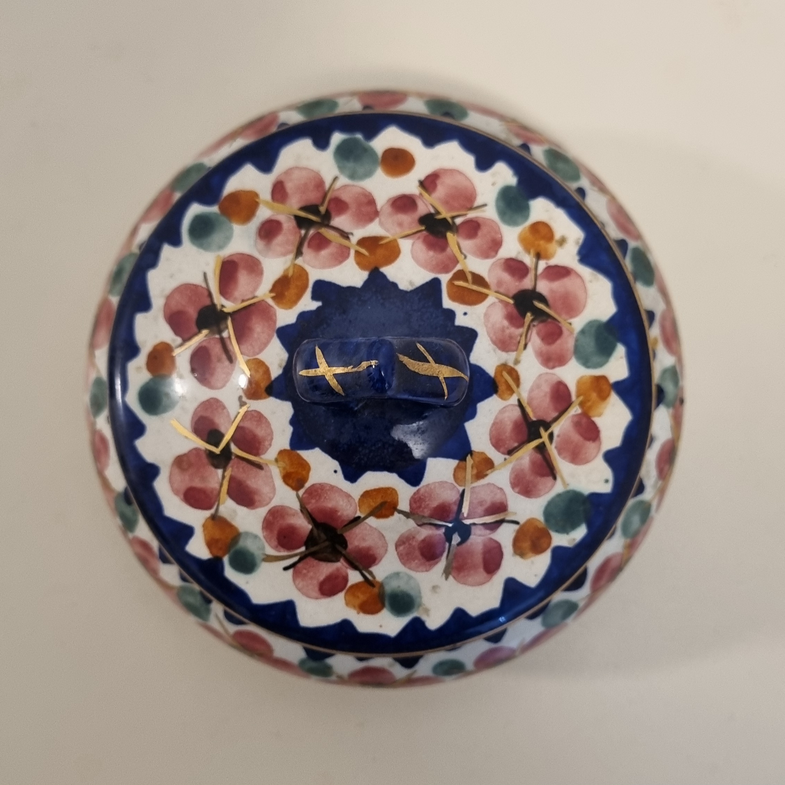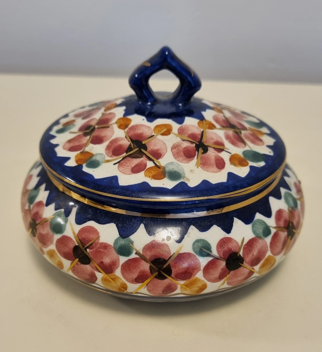 Ceramic trinket dish with lid. Features a floral pattern on a blue background with gold accents.
