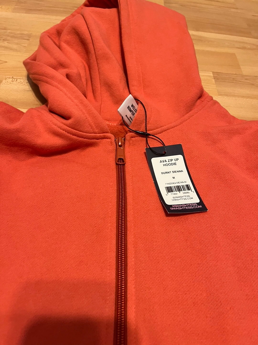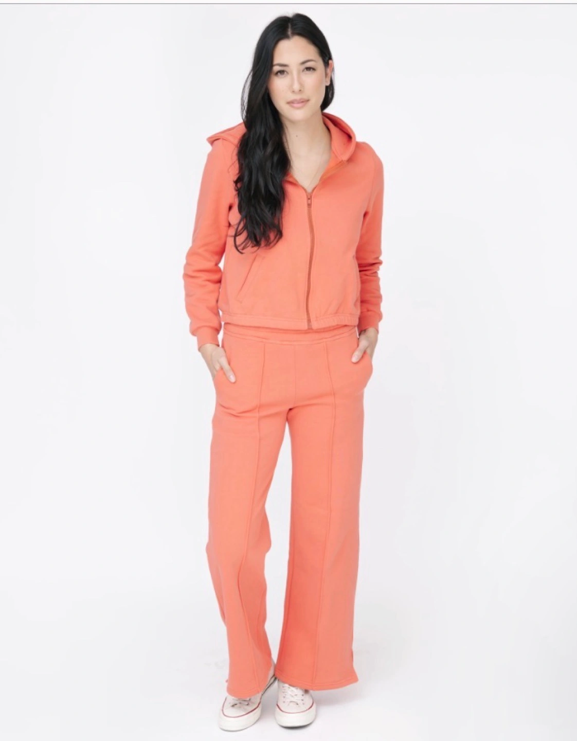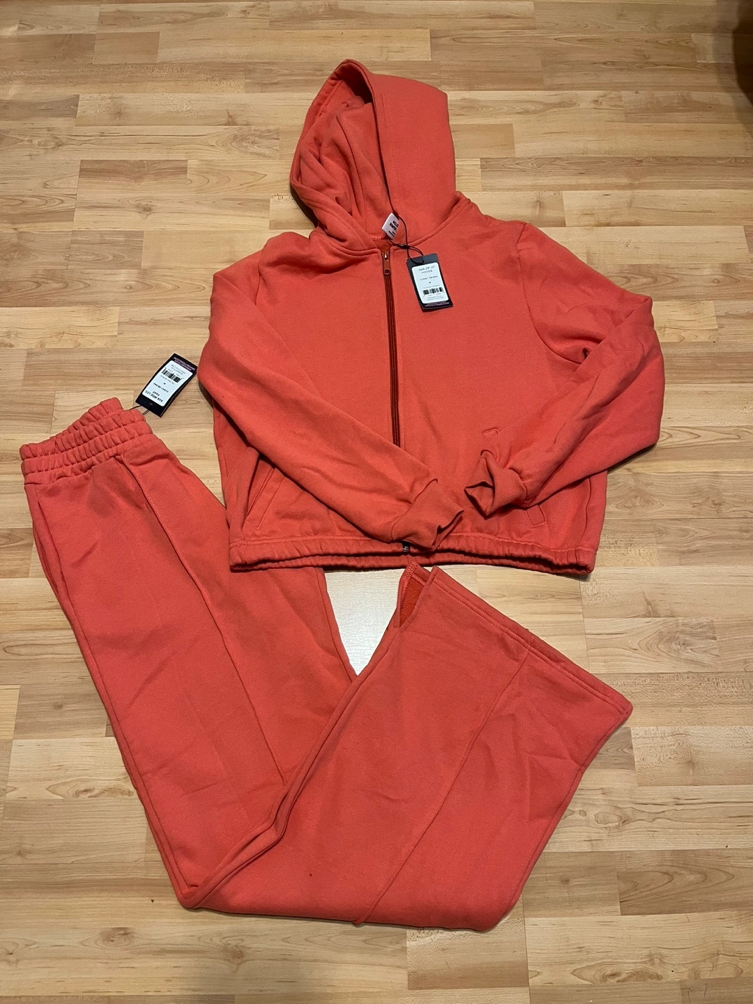 Size M. Burnt Sienna colour. Includes a hooded zip-up jacket and wide leg pants. New with tags. Retail is approx $180 for both pieces.