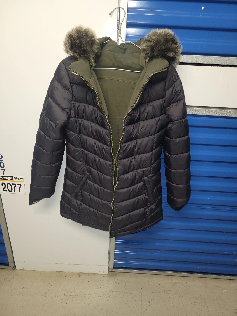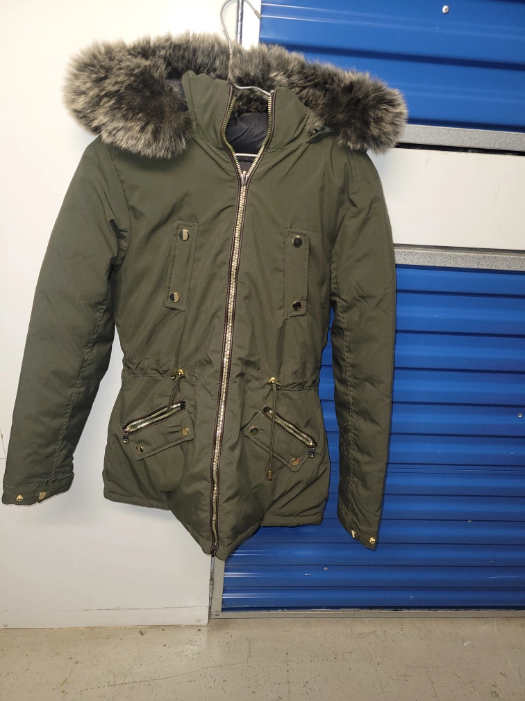 Green winter jacket with black lining. Has a faux fur hood. Two zipper pockets and two flap pockets with button closures. Drawstring waist. Gold coloured hardware. Reverseable