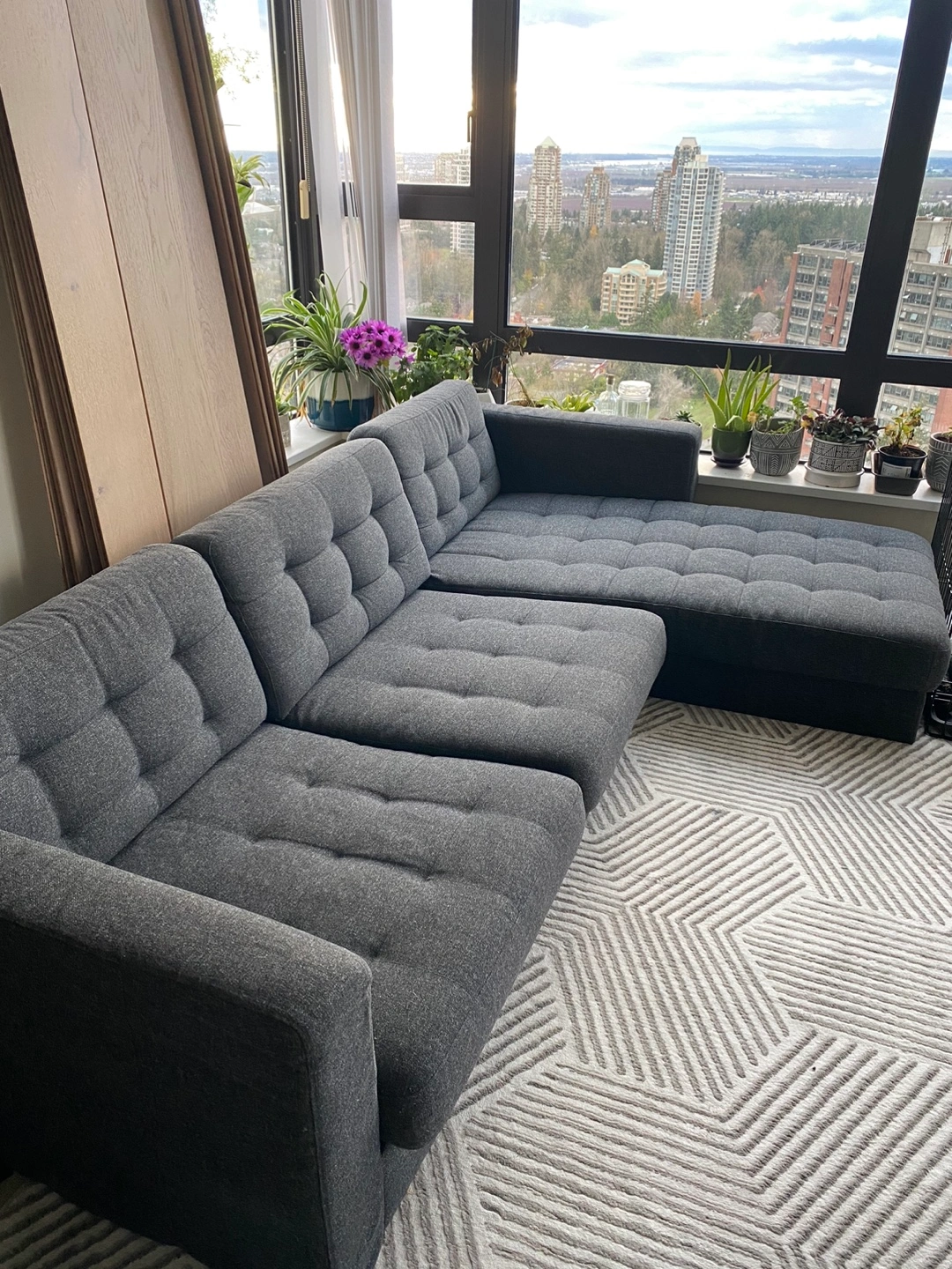 IKEA Sofa with chaise lounge, dark grey fabric with wooden legs. Removable cushion covers. Kept in great condition. There are two springs underneath that are missing but can be provided. You would just need a U-shaped nail to re-install the 2 springs underneath (plastic clip broke off when moving) The couch is not connected between the two pieces to make it easier for moving, but the hardware will be included. Open to offers