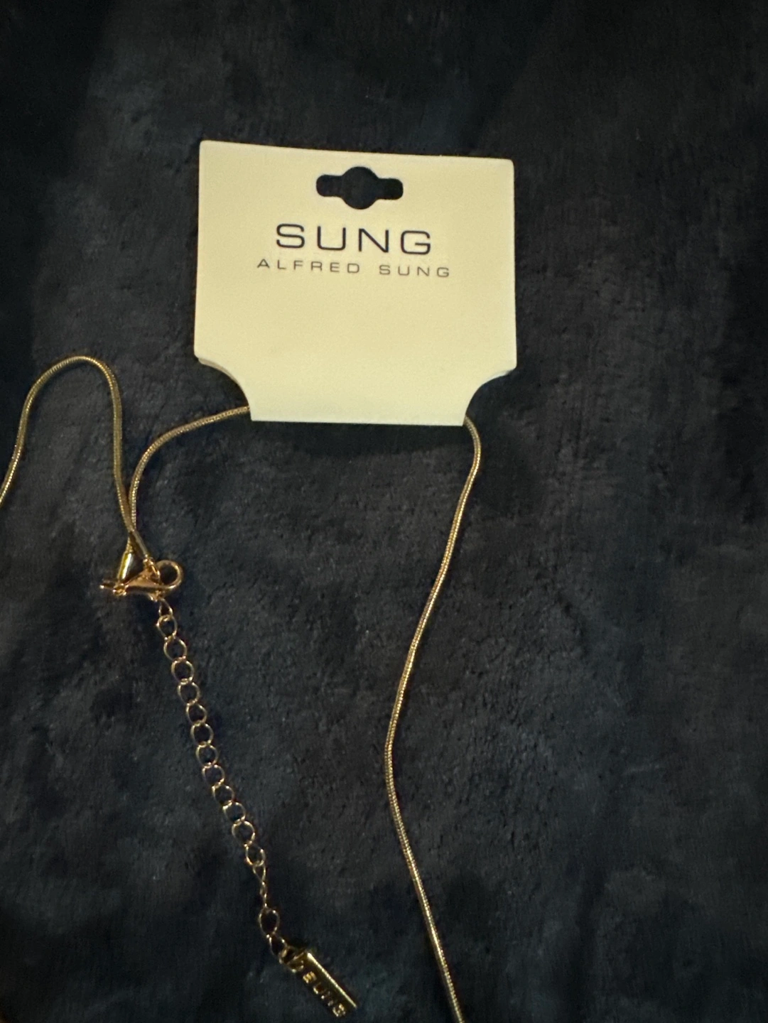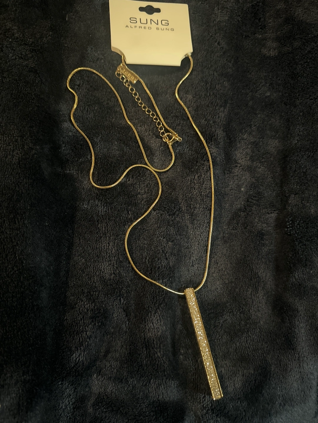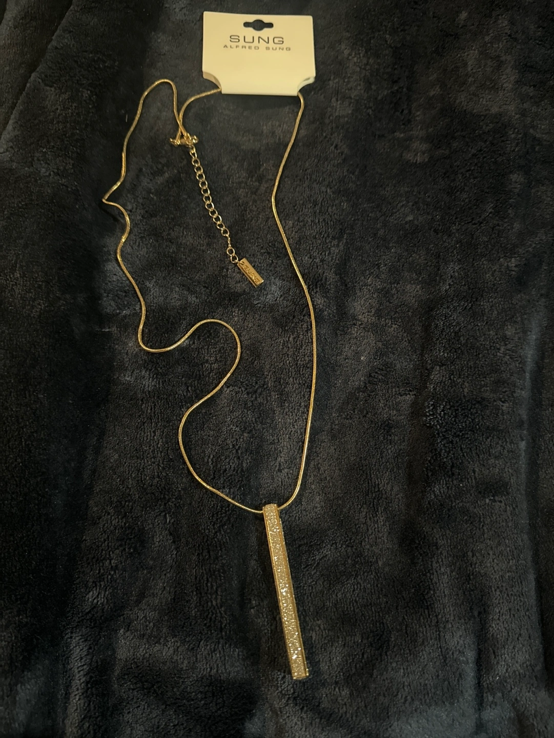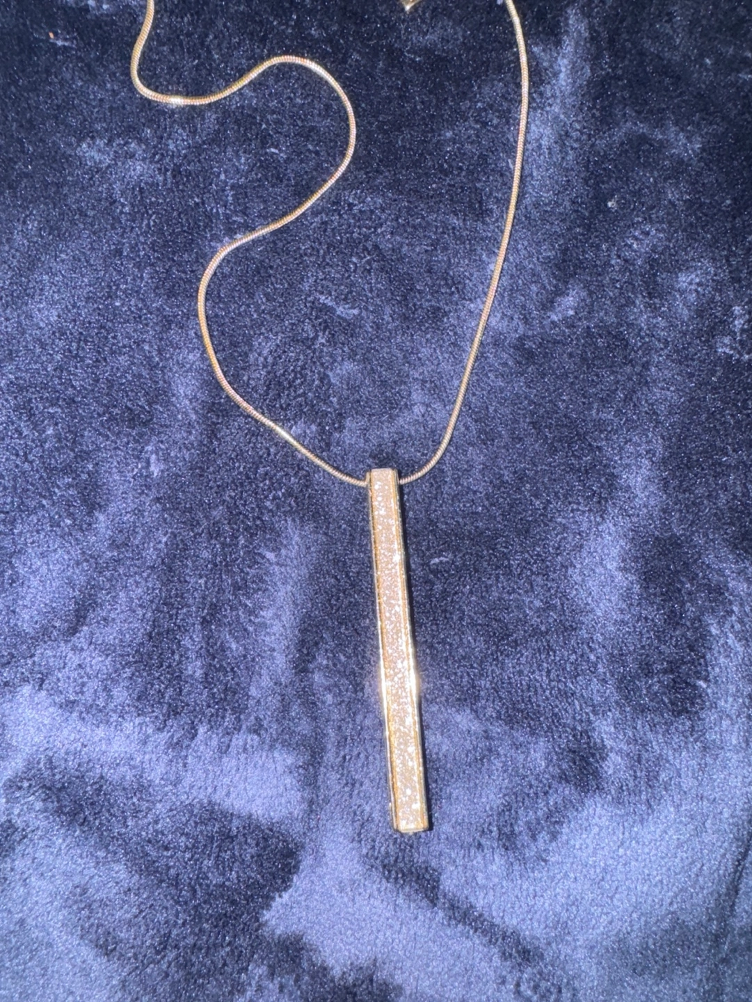 Gold chain with a long, thin bar pendant covered in small crystals. It has an adjustable length.