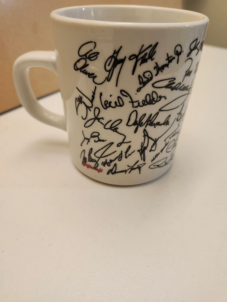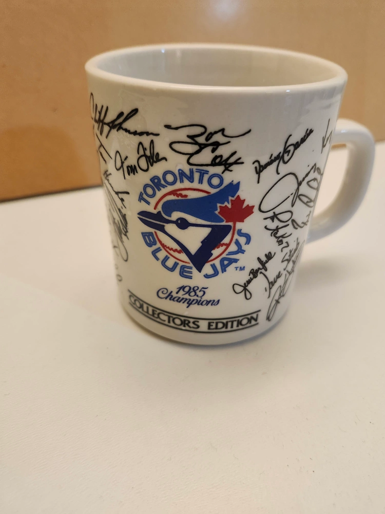 PRICE FINAL SALE NOT NEGOTIABLE.Toronto Blue Jays Collector's Edition mug featuring signatures of team members. 1985 Champions. excellent condition price firm only cash no delivery only pickup 801 O'Connor drive outside TD bank door.