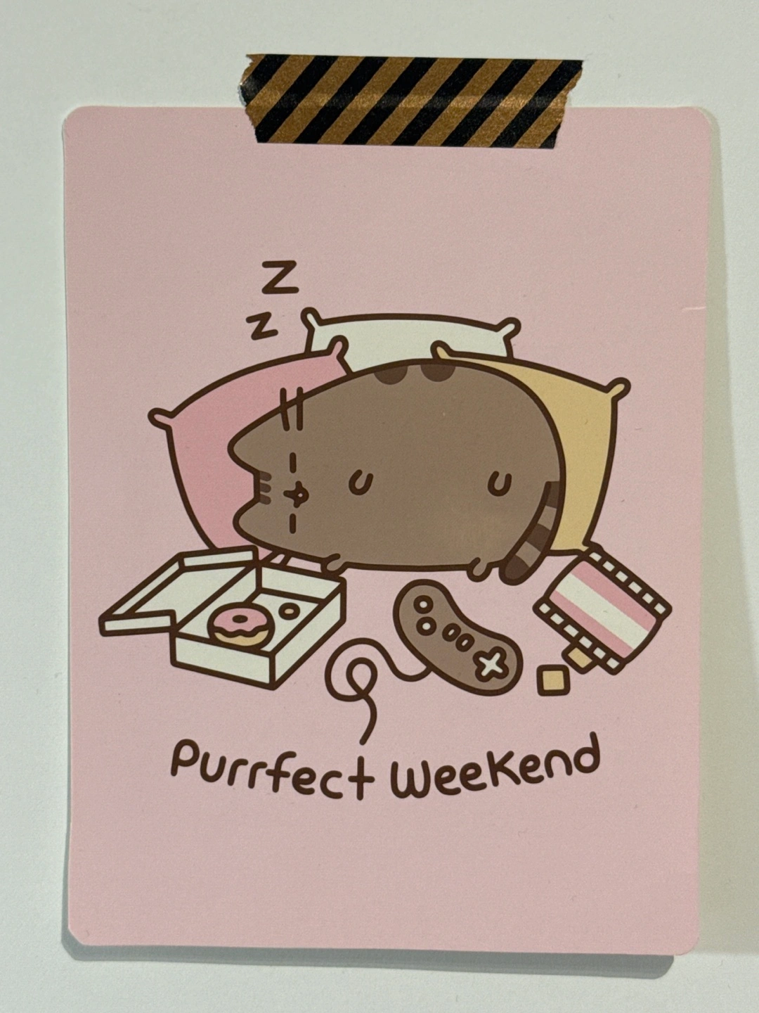 Blanket features a cute Pusheen cat design. It has a pink background with a cat sleeping on a pillow. The card says 'purrfect weekend' in cute font.