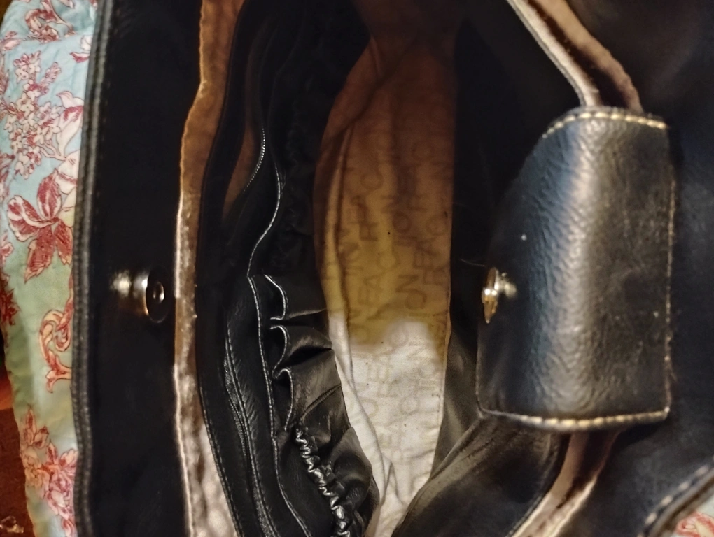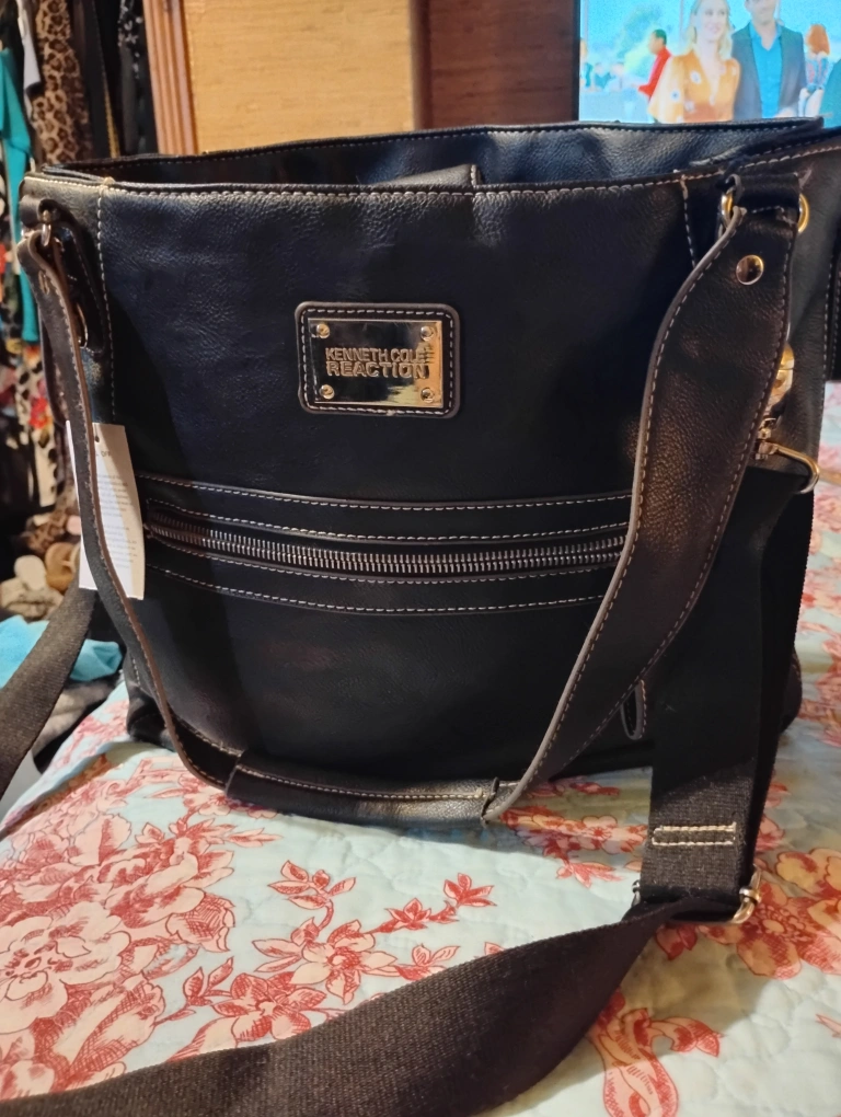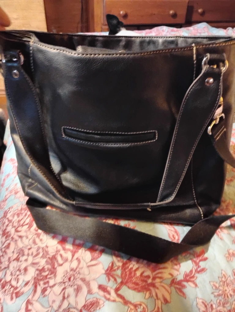 Black tote bag with multiple pockets inside and out. Has an adjustable shoulder strap. Great for everyday use.