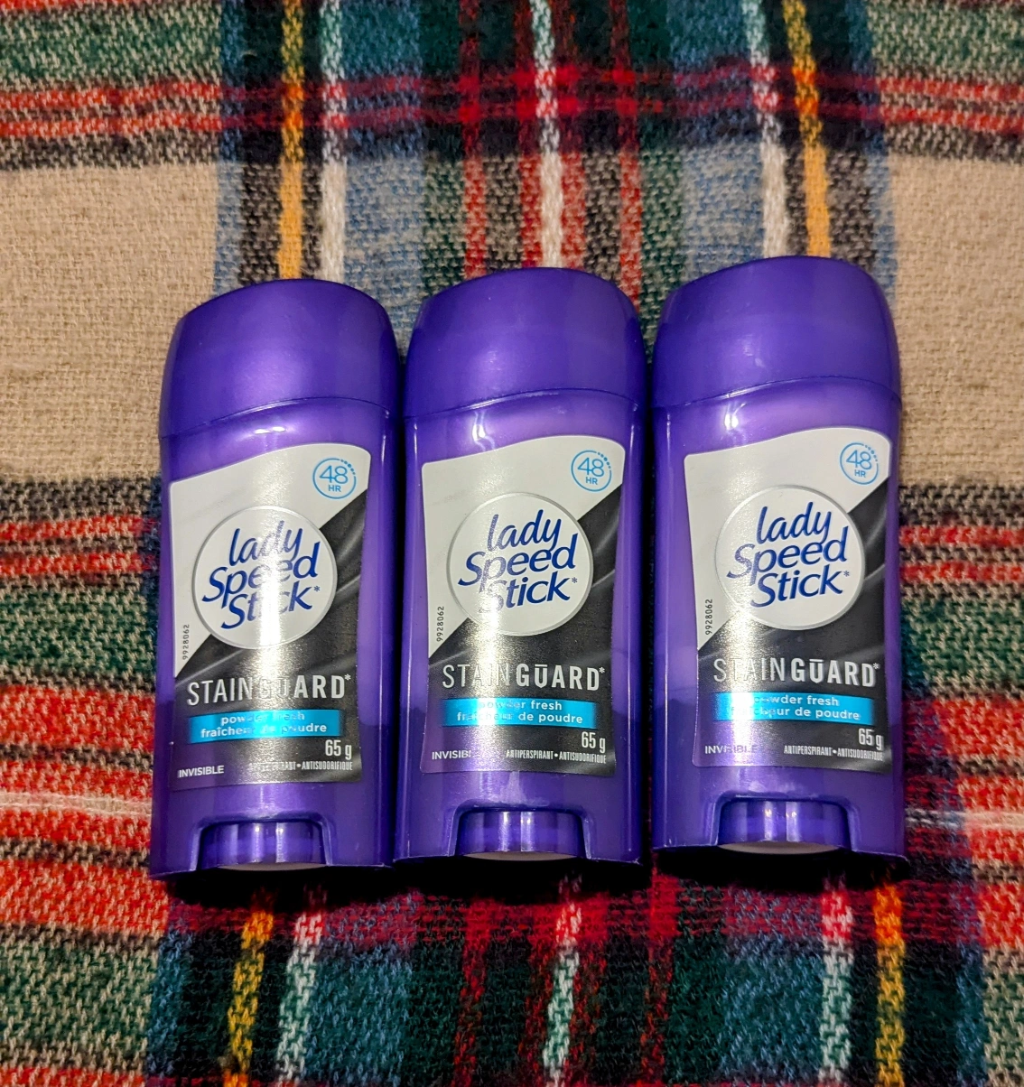 Three Lady Speed Stick deodorants, Stain Guard, in the powder fresh scent.