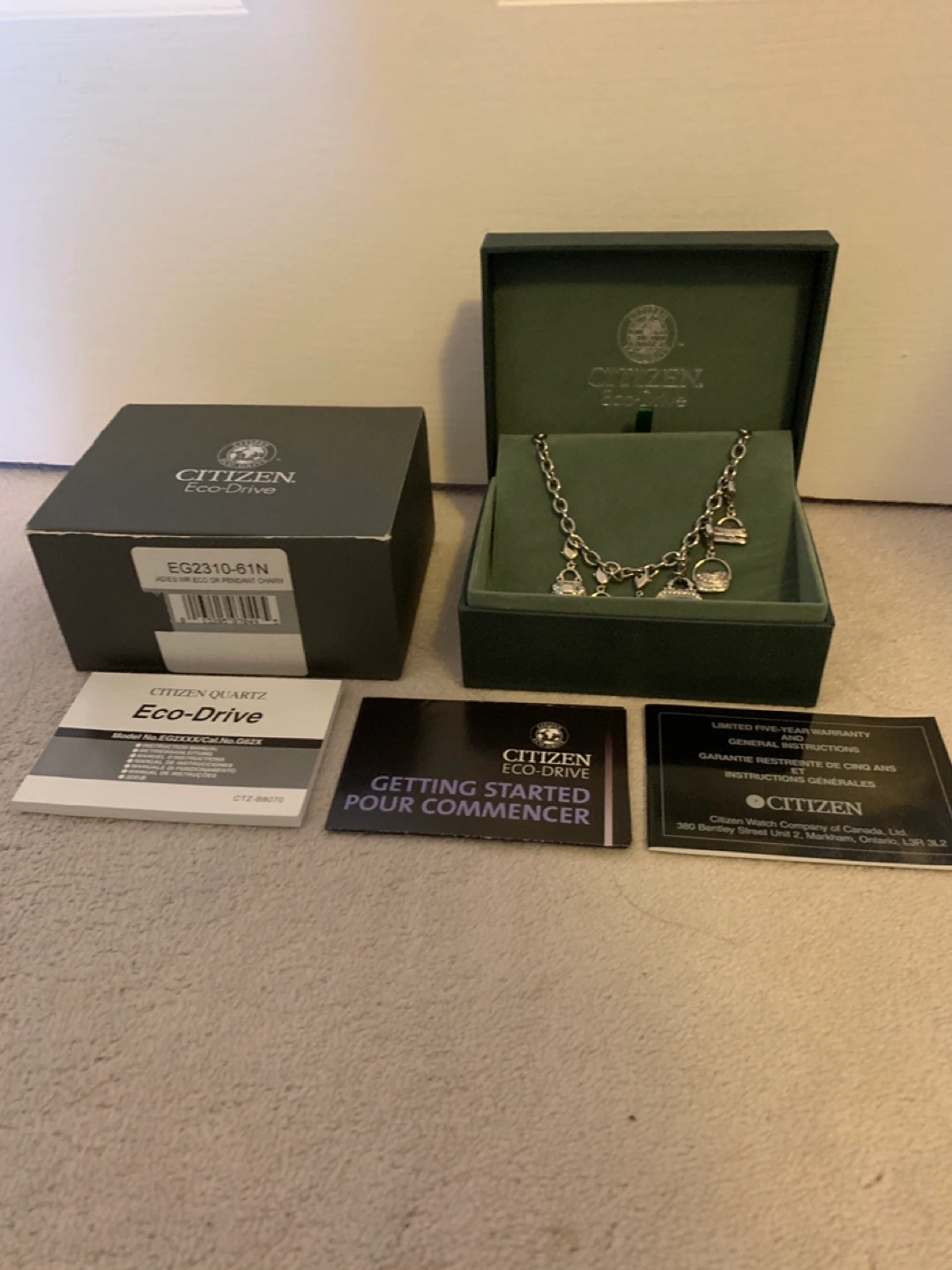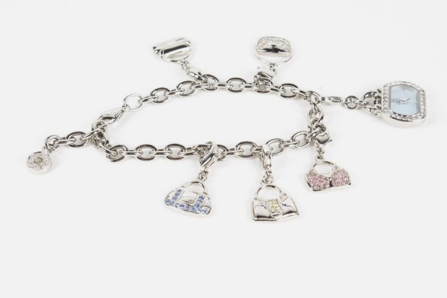 Description: Silver chain with small charms including a working watch. Comes with original box and papers.