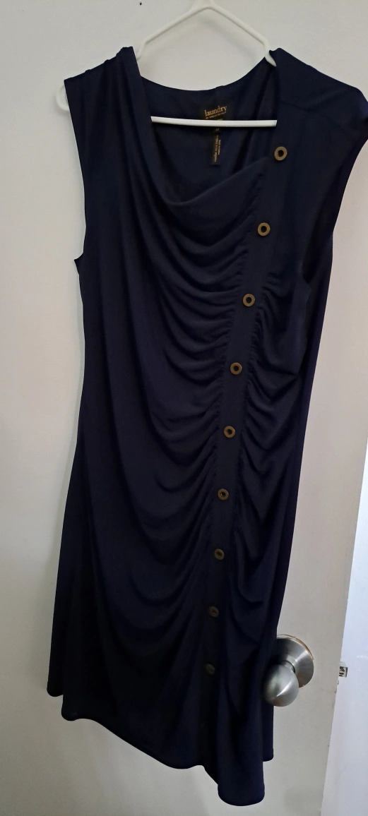 Selling a navy dress with gold buttons, sleeveless. Designed in Los Angeles, made in China.
