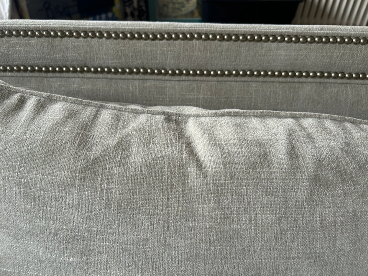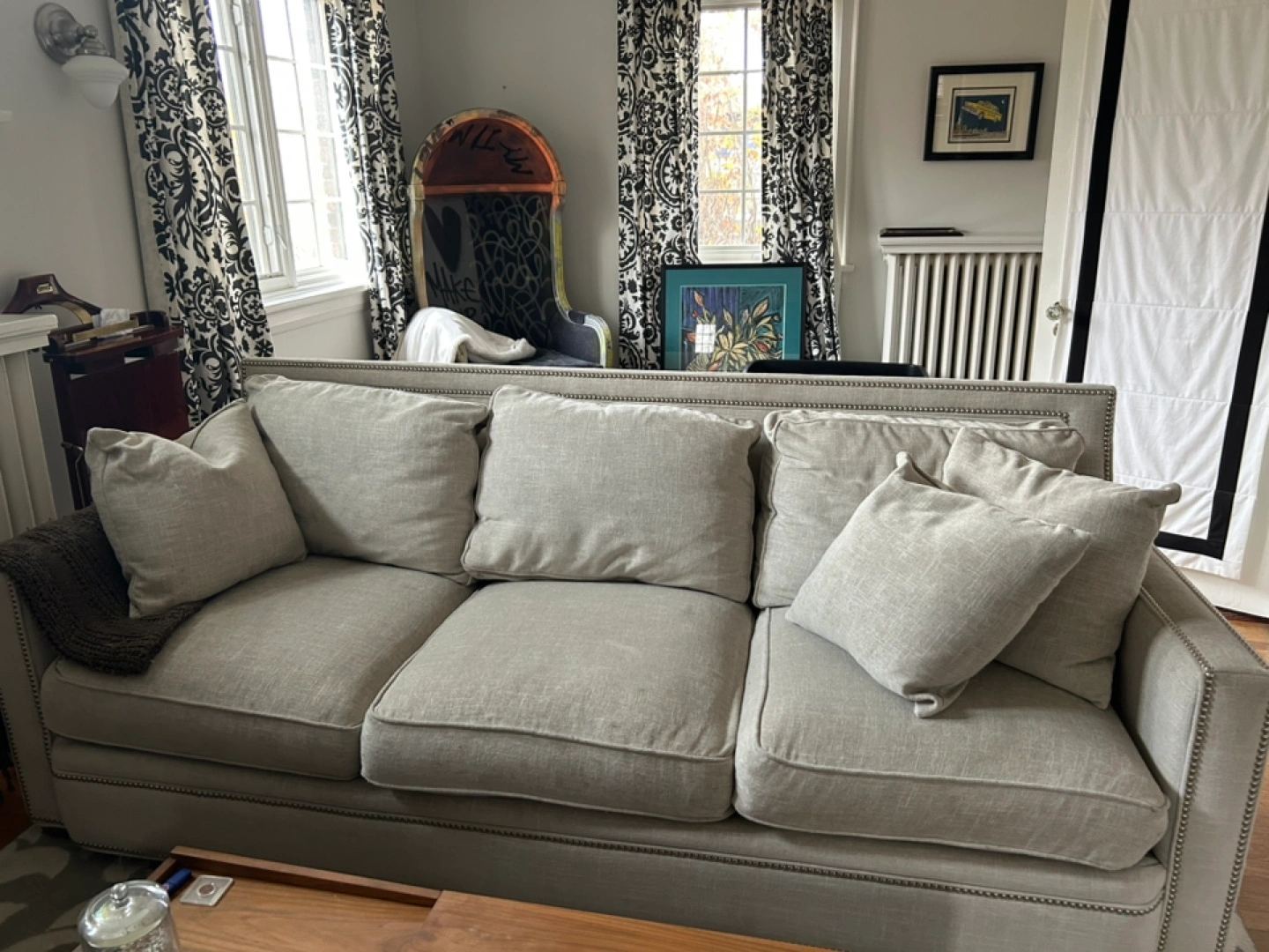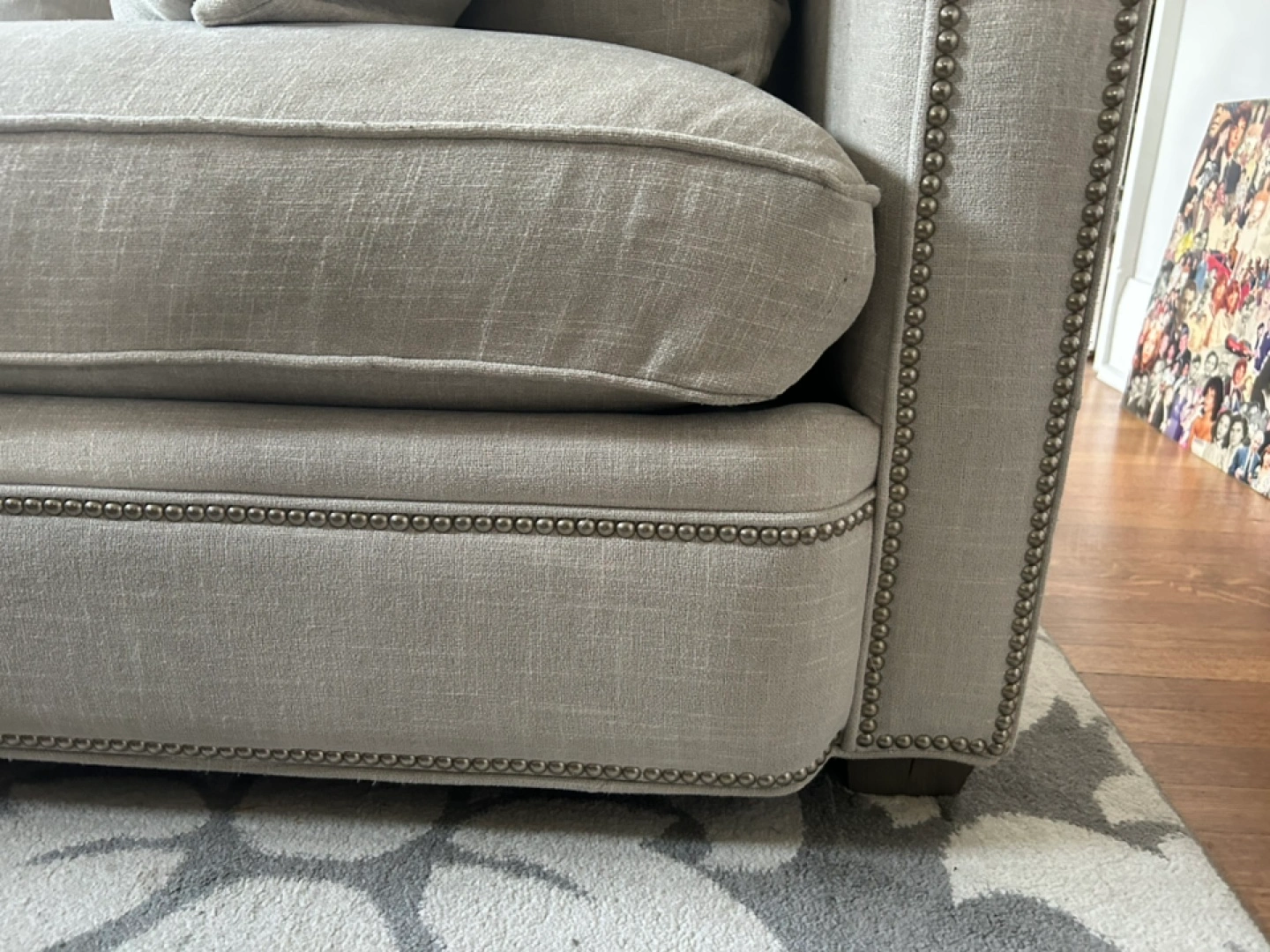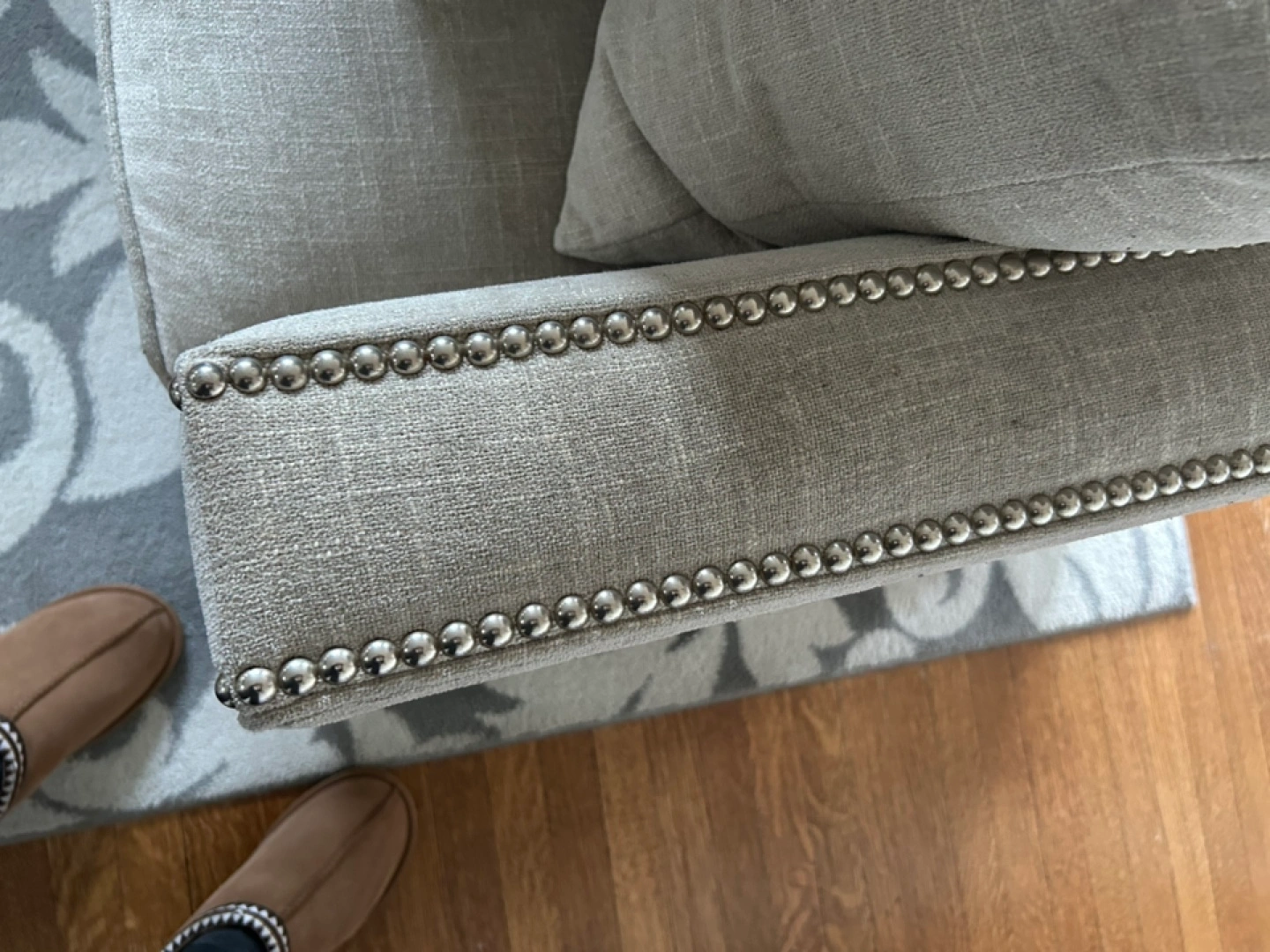 Grey Linen Sofa with Nailhead Trim
