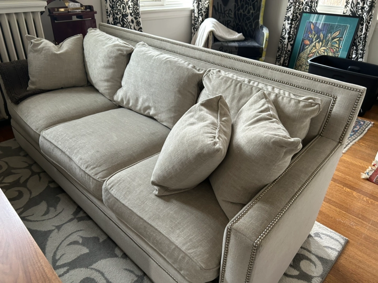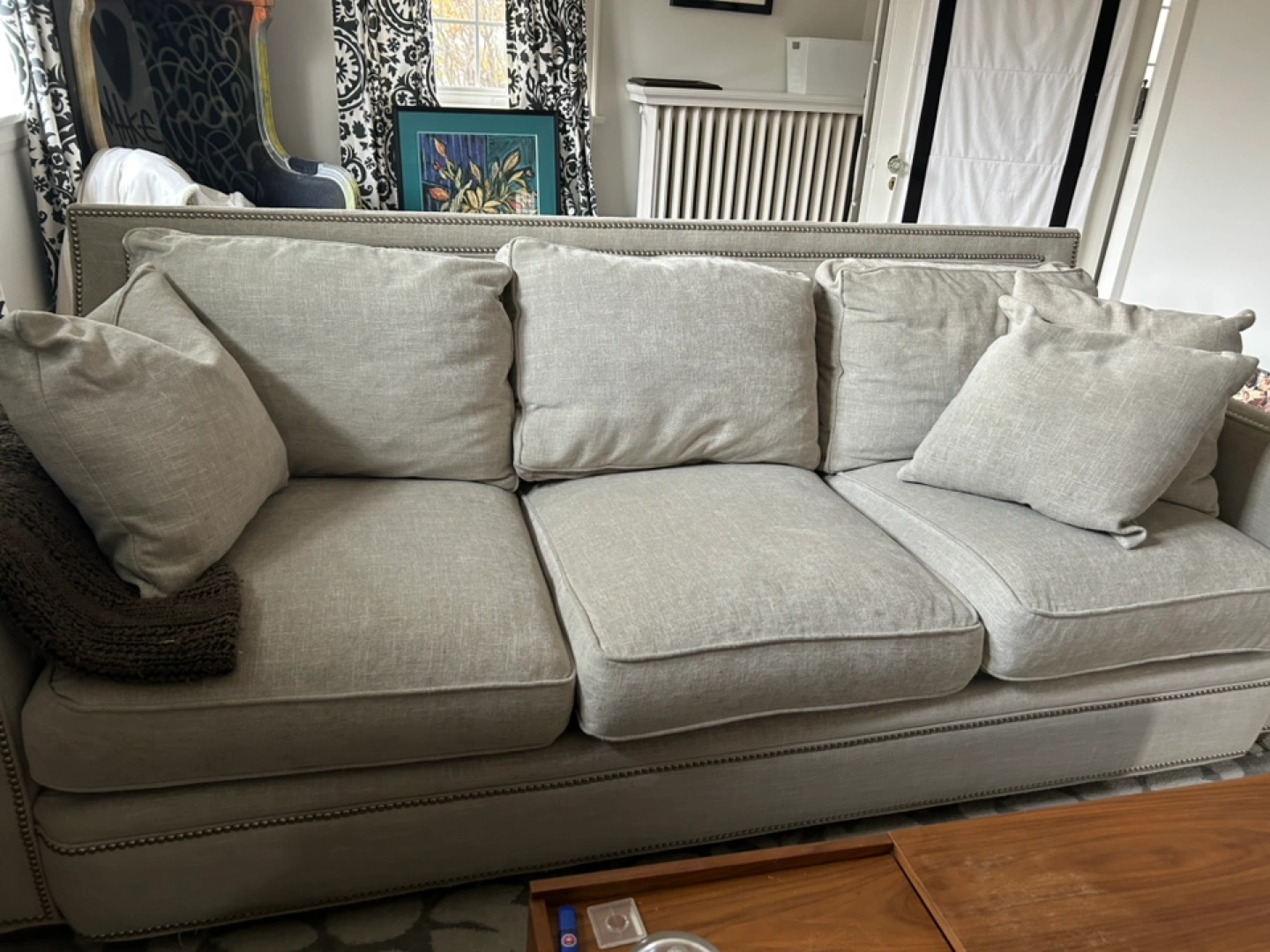 Grey linen sofa with nailhead trim. Three cushions. Excellent quality and comfortable. Open to offers.