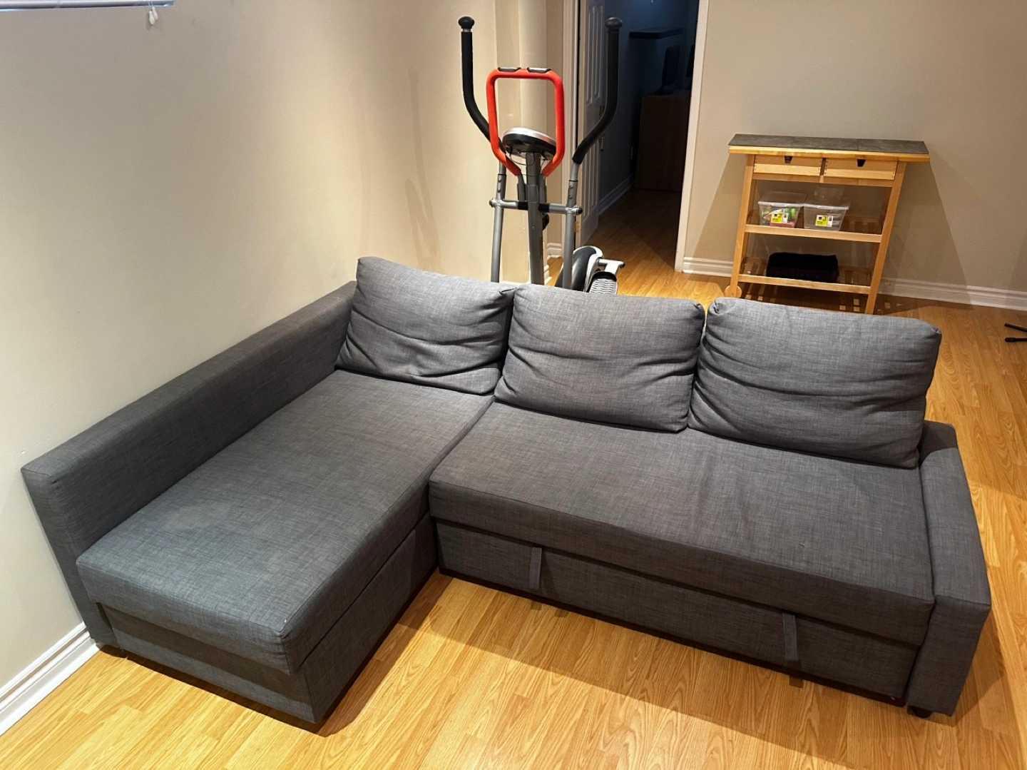 Grey sectional sofa bed. Pull-out bed with storage. Includes three cushions.