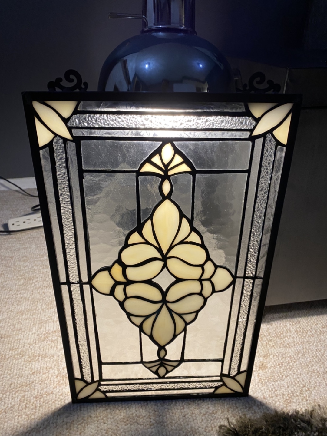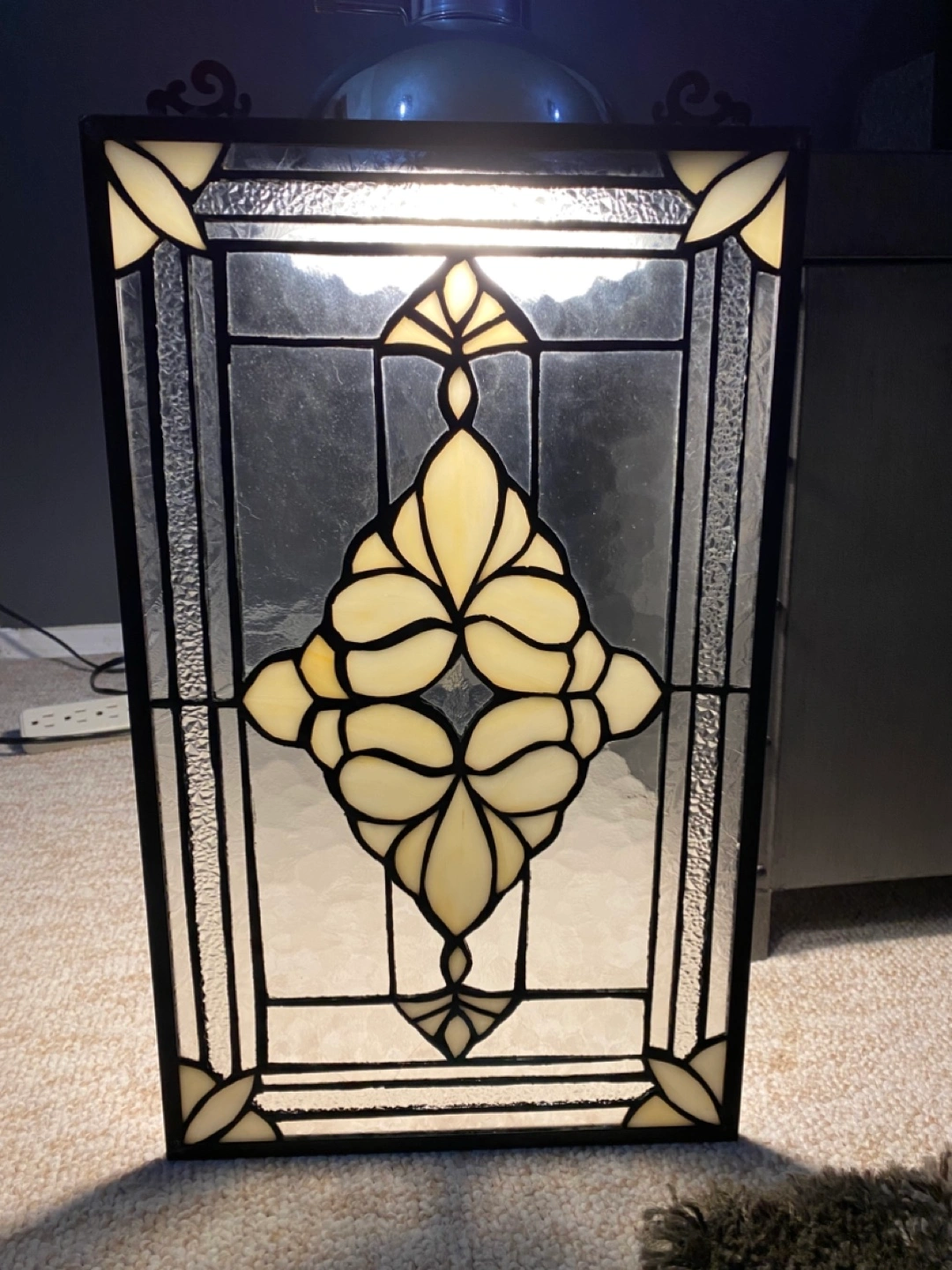 Stained glass window panel with a black frame and an ornate design.in excellent condition.