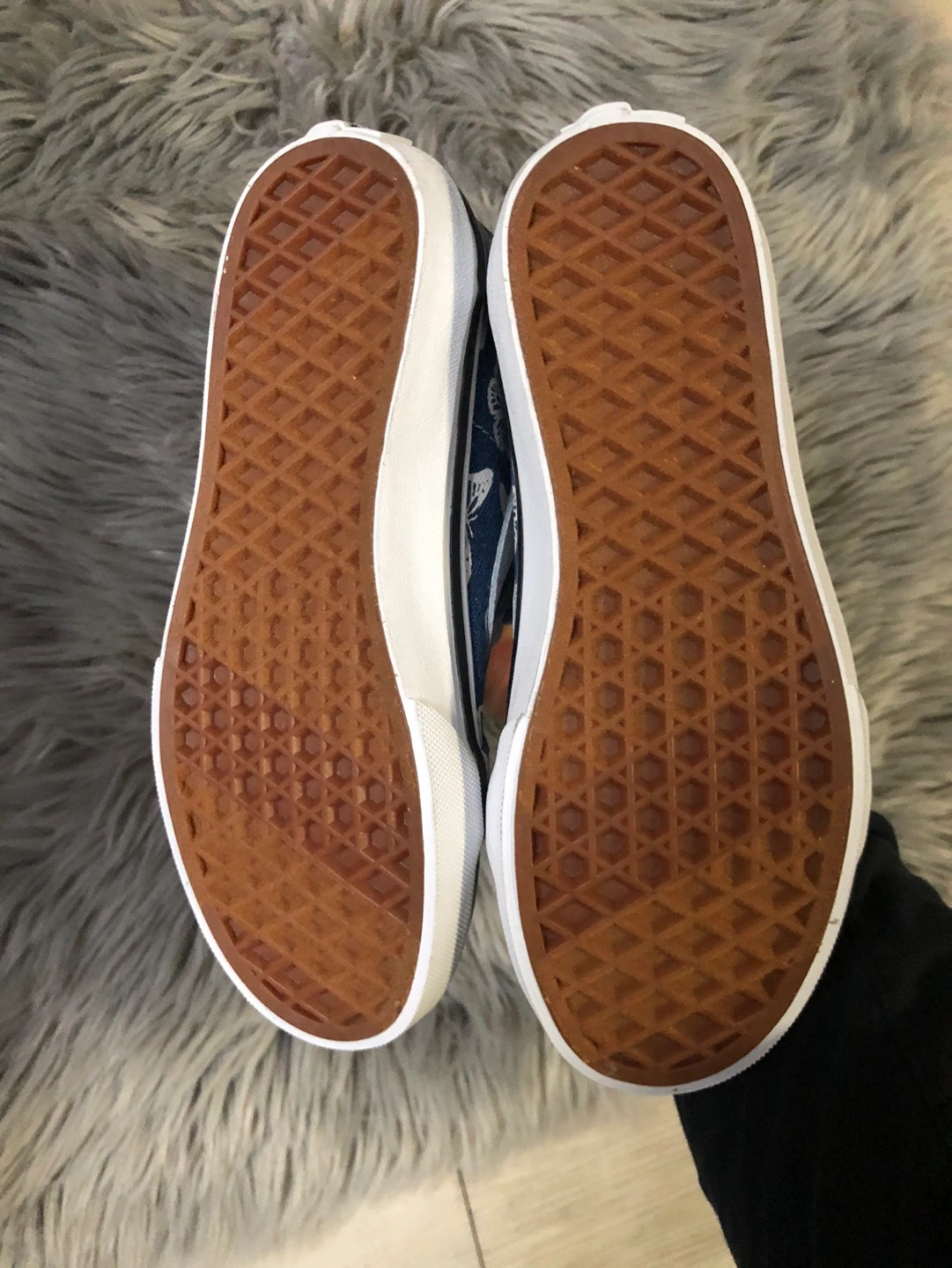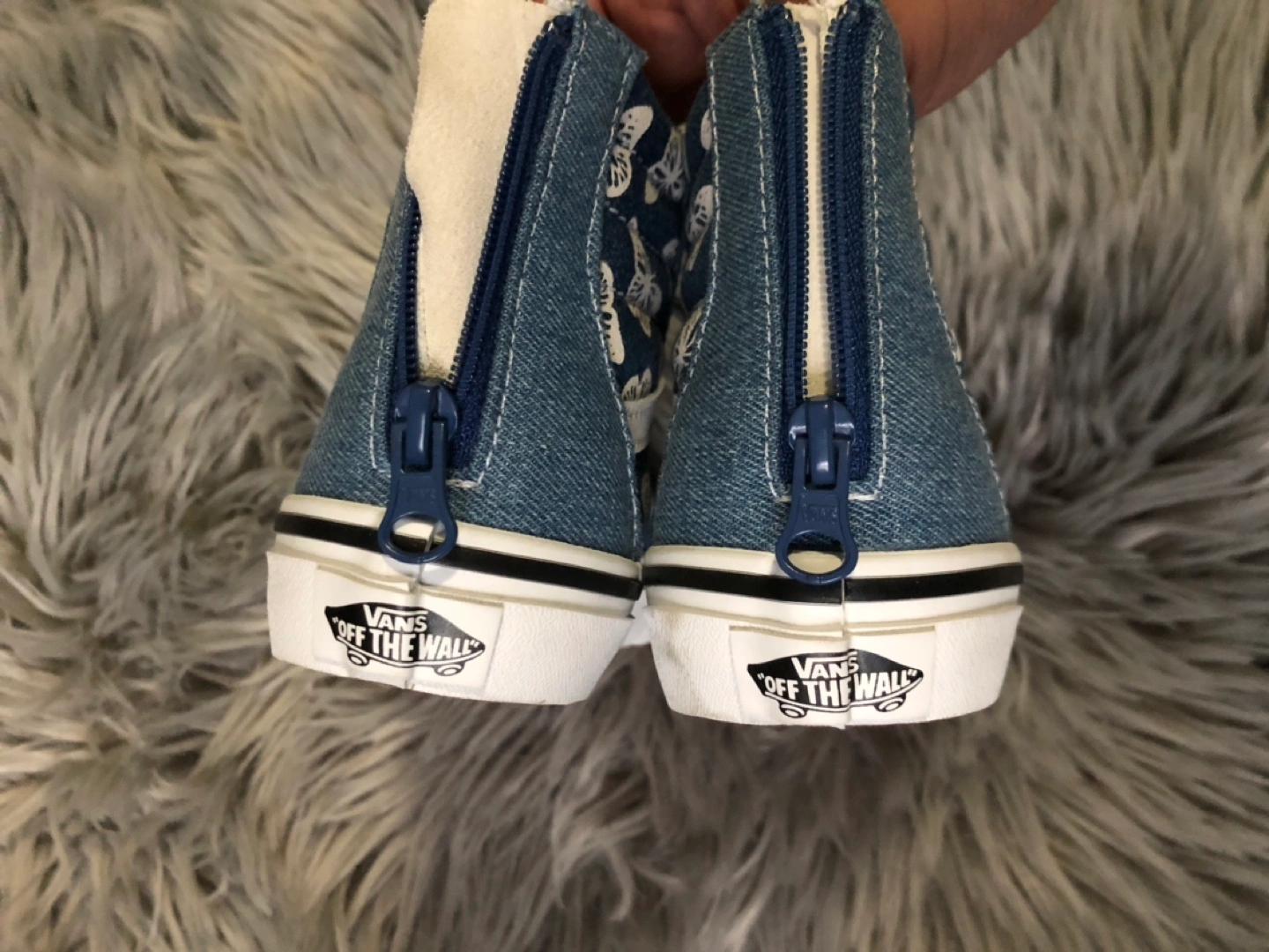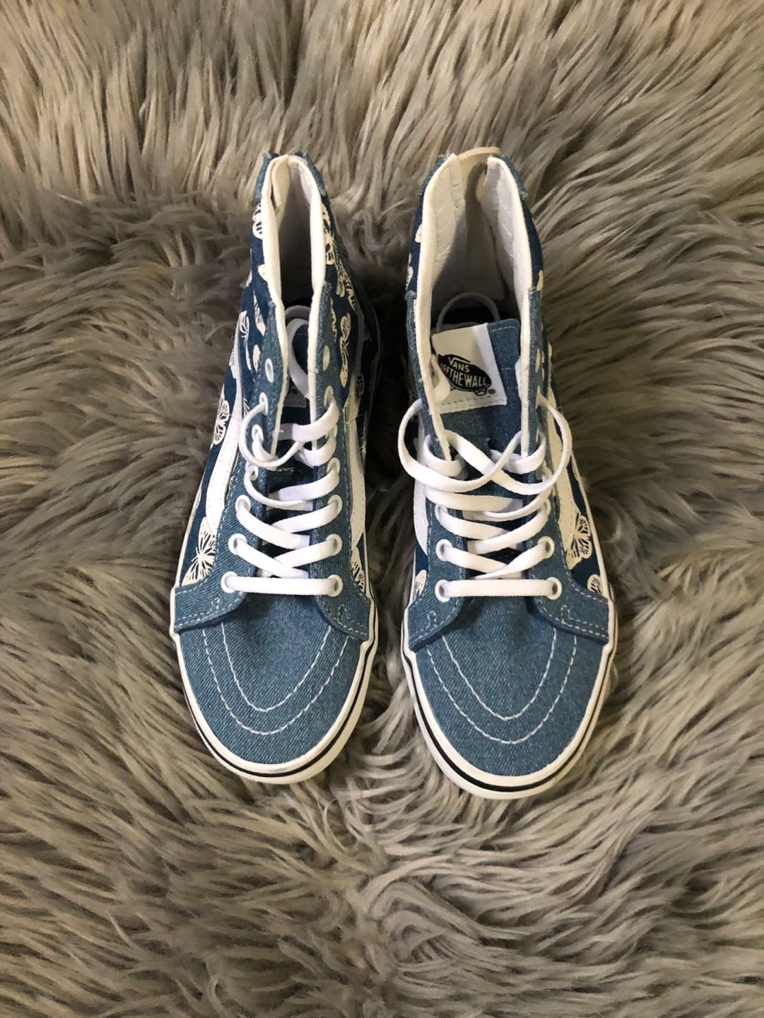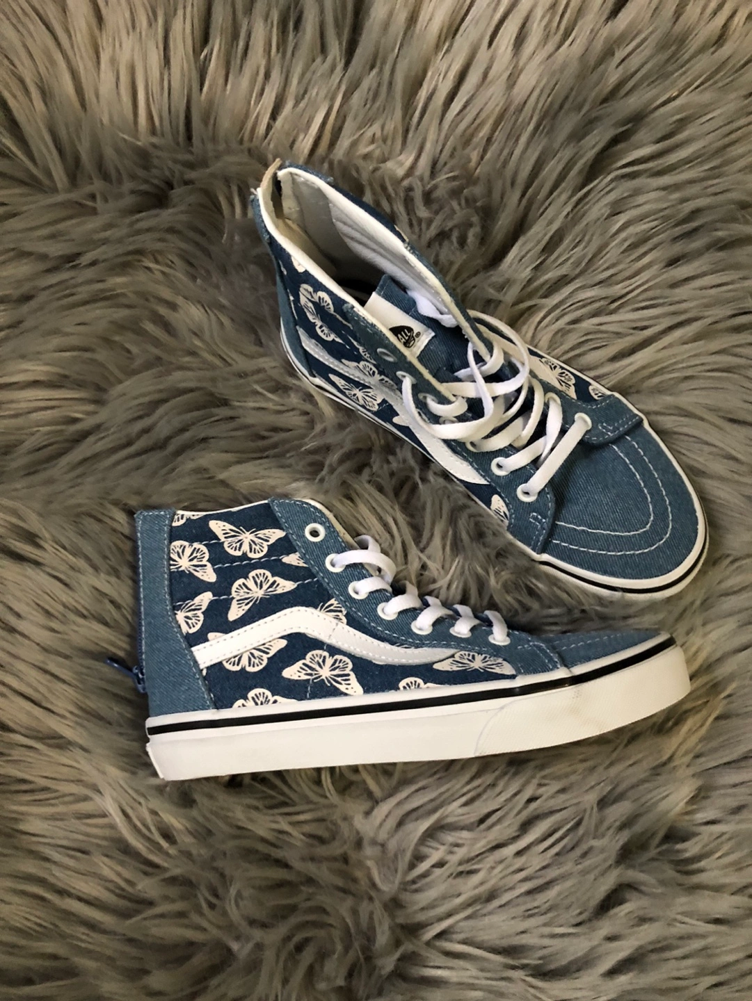 Blue denim with butterfly design, white laces, back zipper. No box.