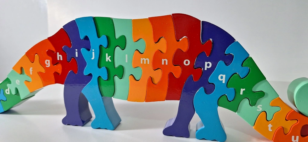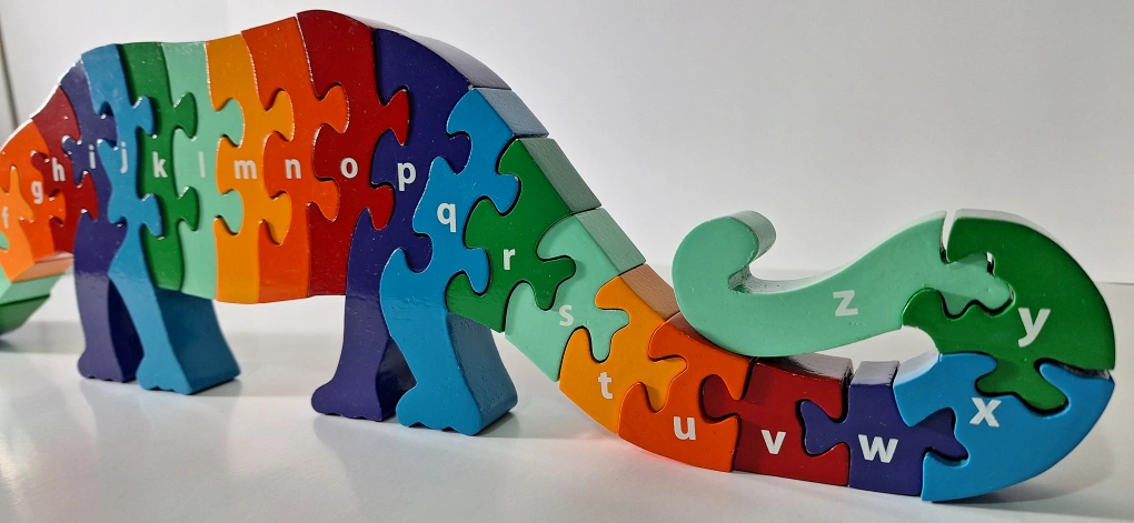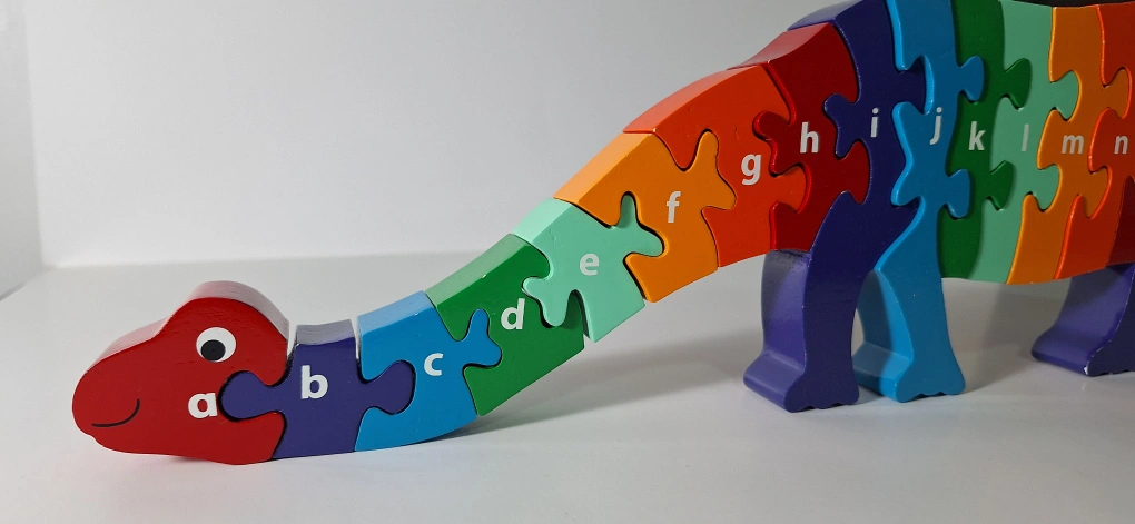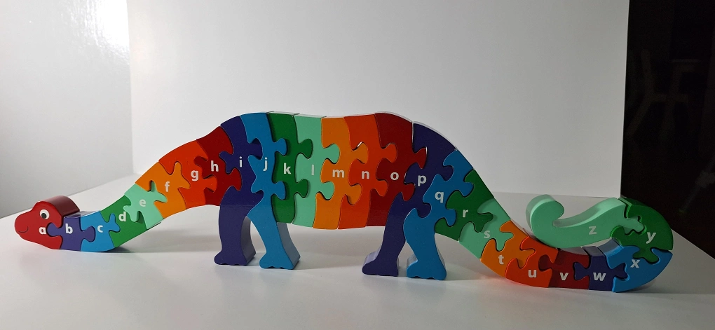 Wooden alphabet puzzle shaped like a dinosaur. Letters are letter coded and pieces fit together. Great for learning the alphabet!