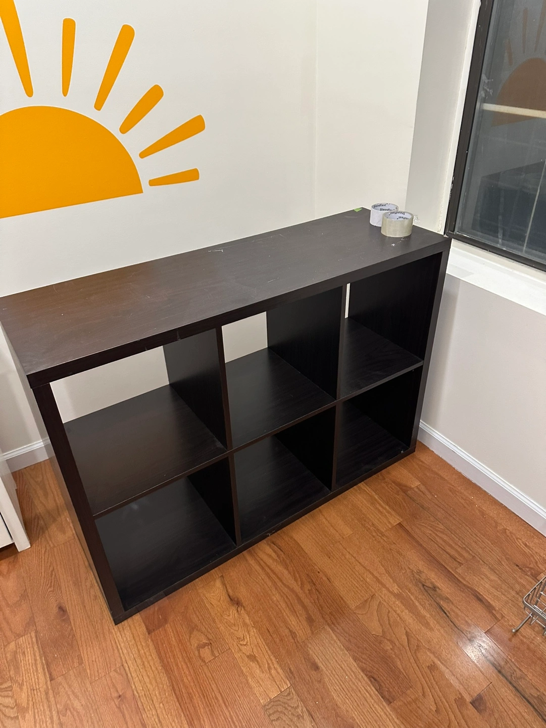 Black cube shelf with six compartments. Great for organizing books, decor, and more. It wobbles a bit but can totally be reinforce to be stable.