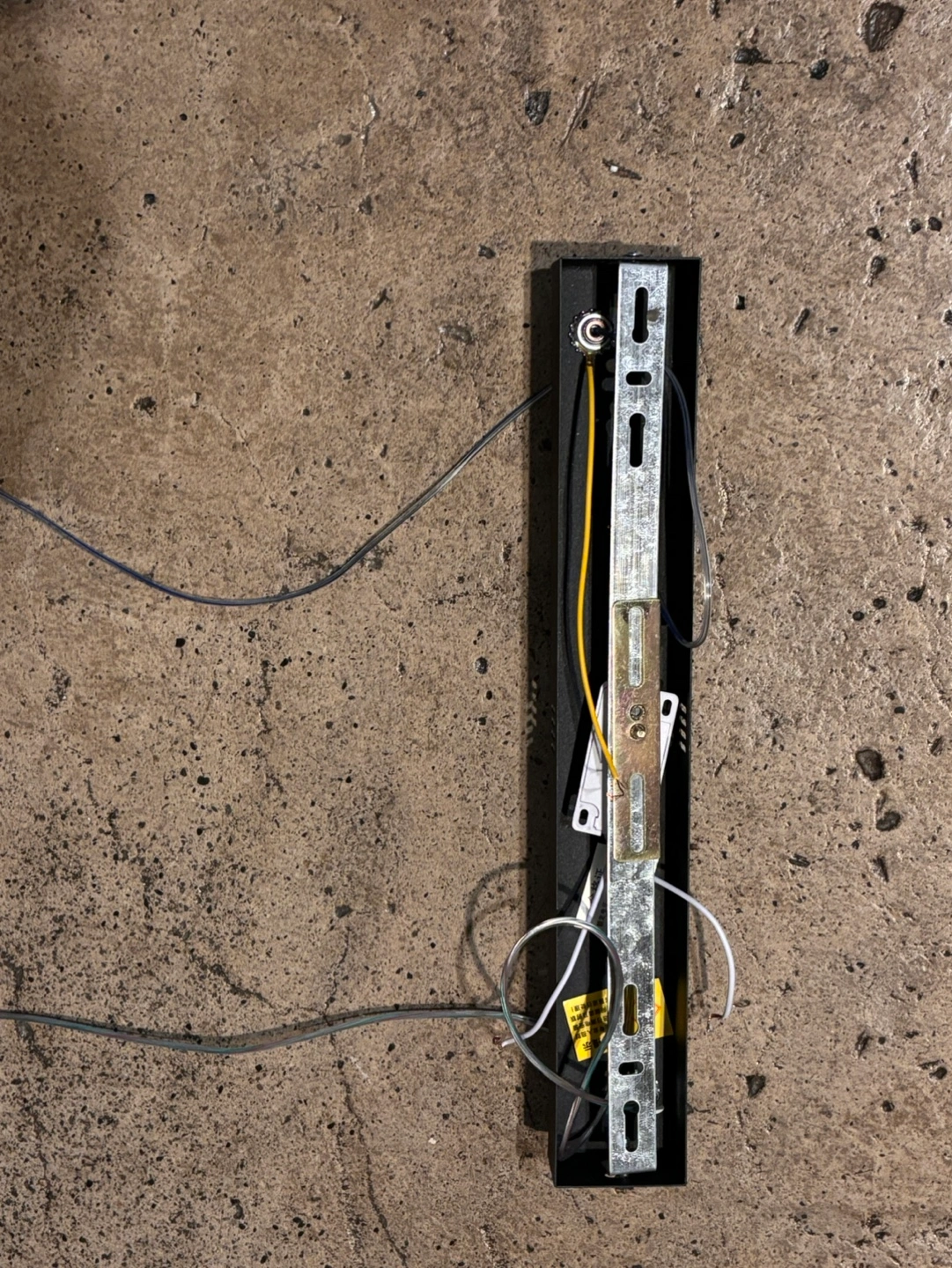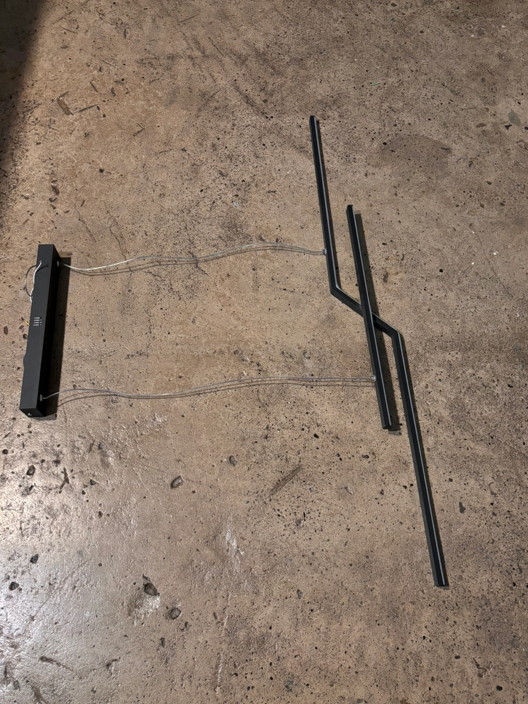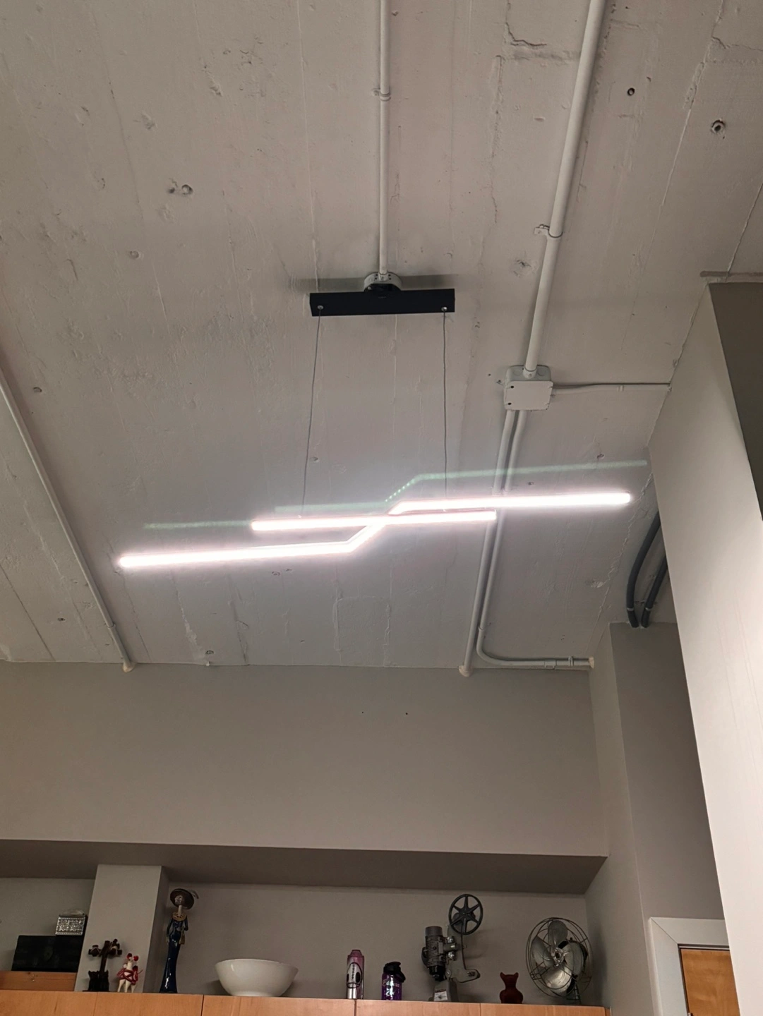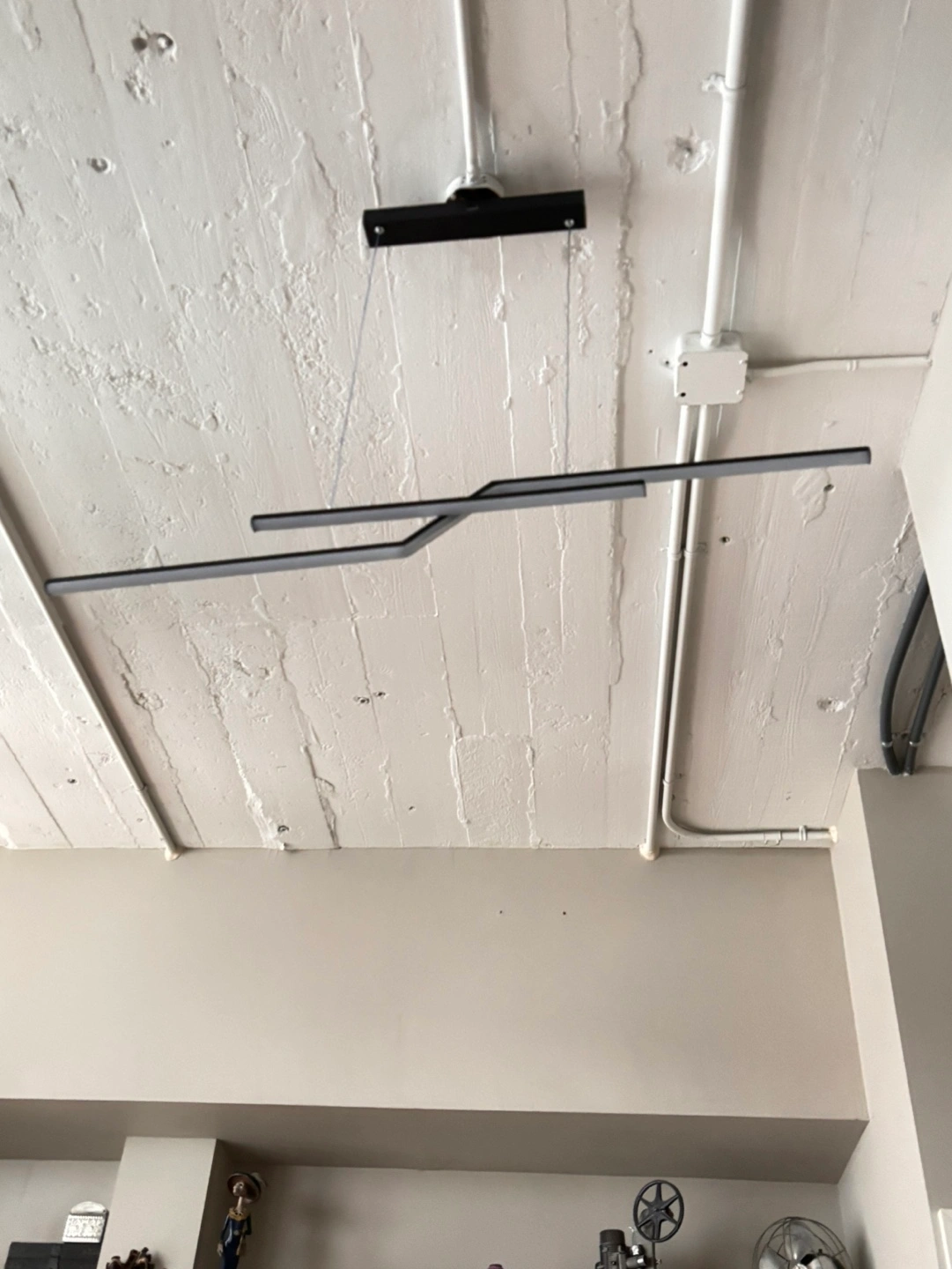 Black linear LED chandelier. The fixture comes with two lights that are suspended from the ceiling with adjustable cables dimmable white light