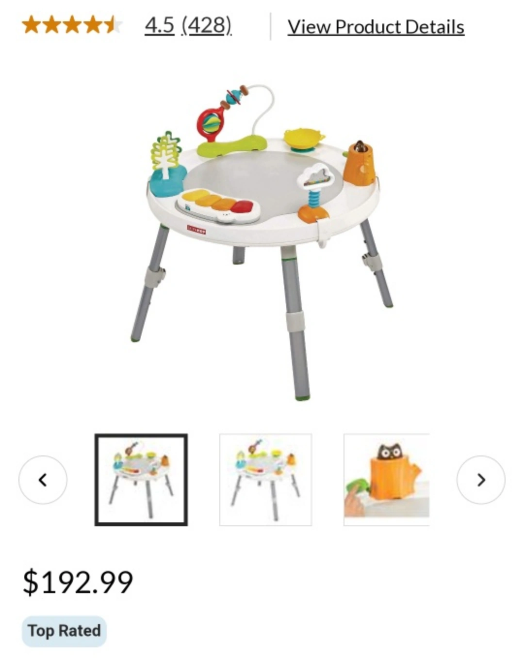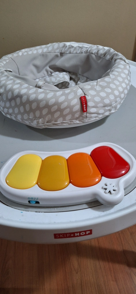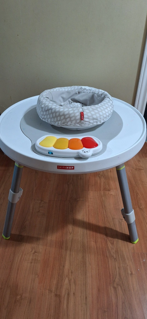 Activity centre with a removable seat that can be used as a stand-alone table. Features musical piano keys. Additional toys not included.