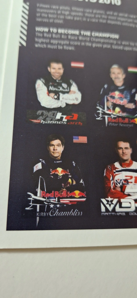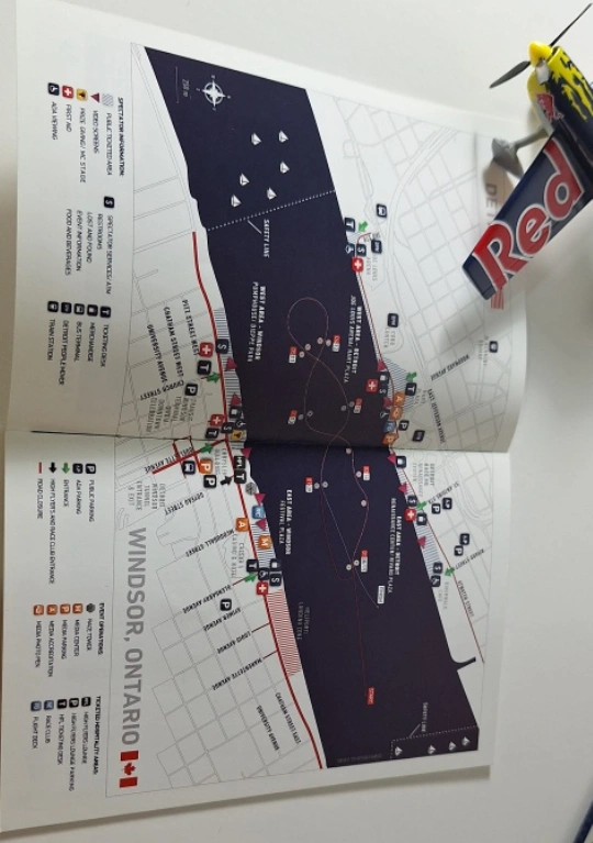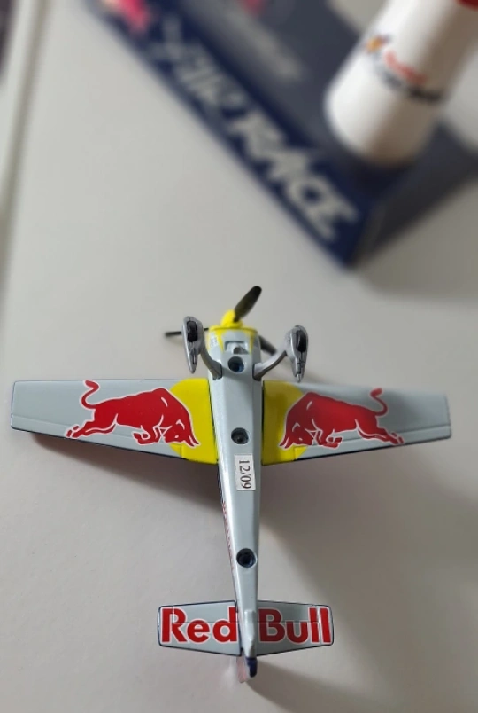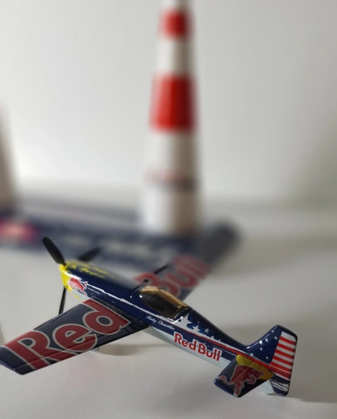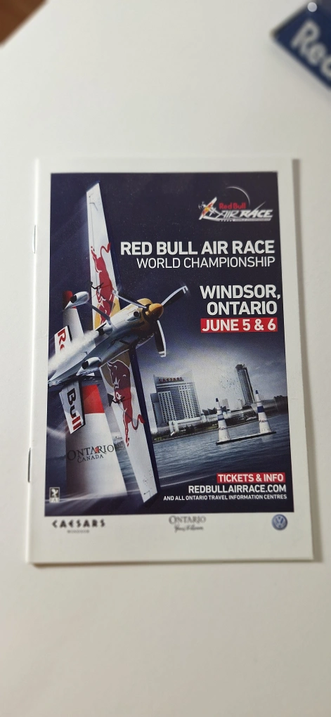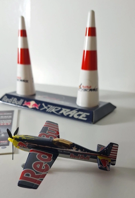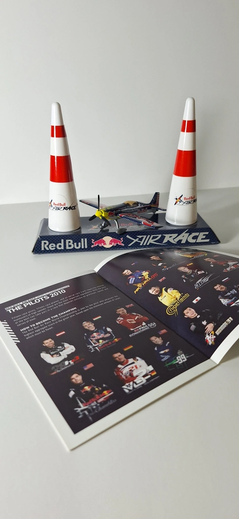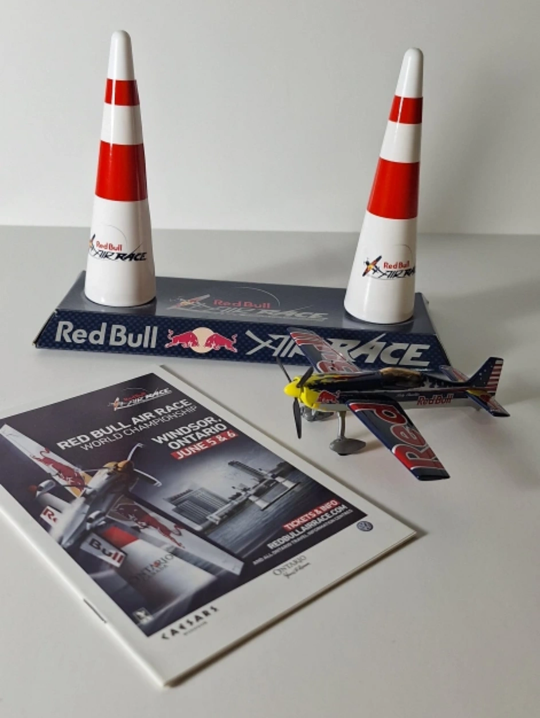 Red Bull Air Race miniature plane and display set. Includes a miniature plane, two cones and a display stand. Also included is a pamphlet for the 2010 Red Bull Air Race World Championship in Windsor, Ontario.