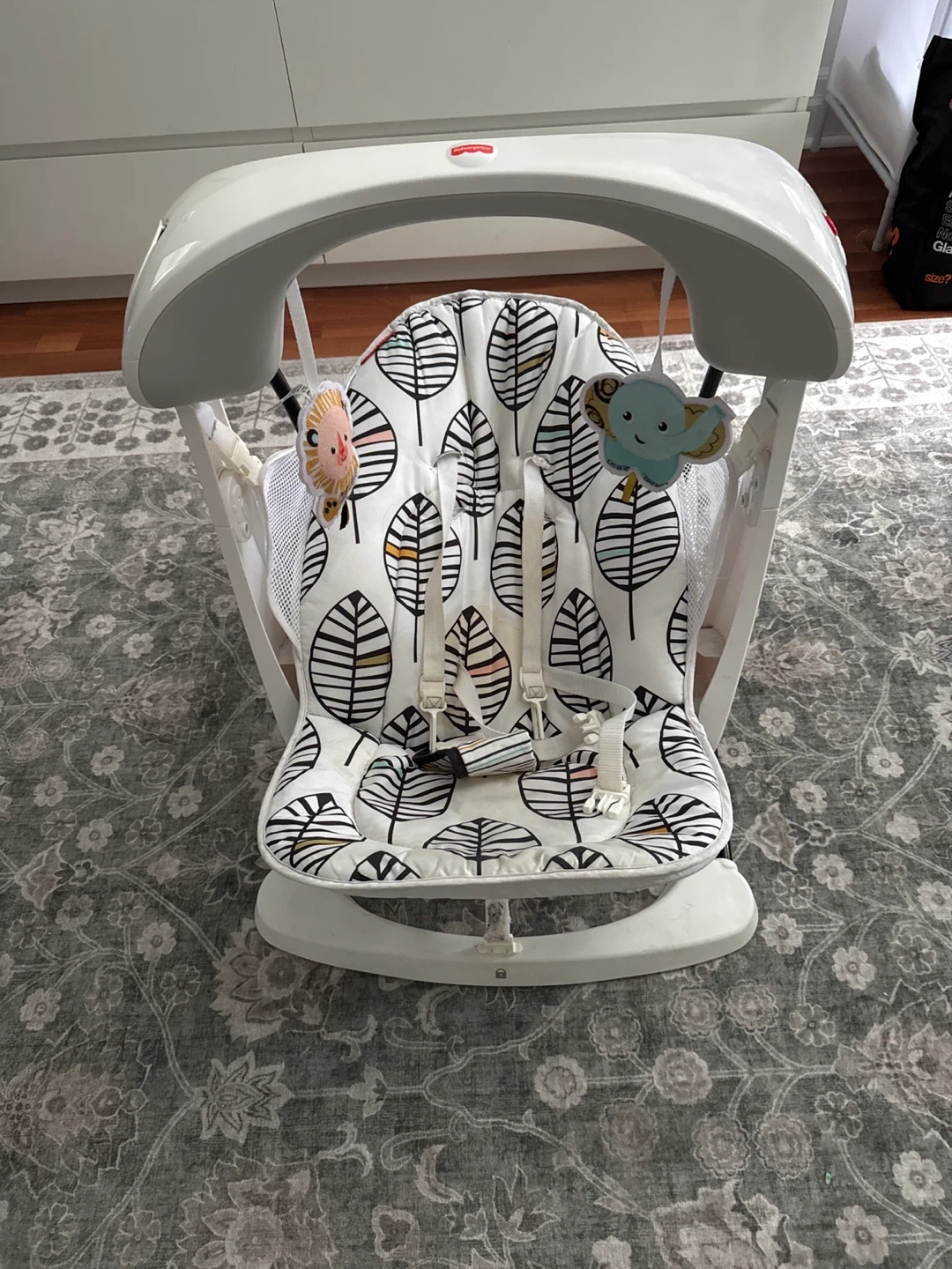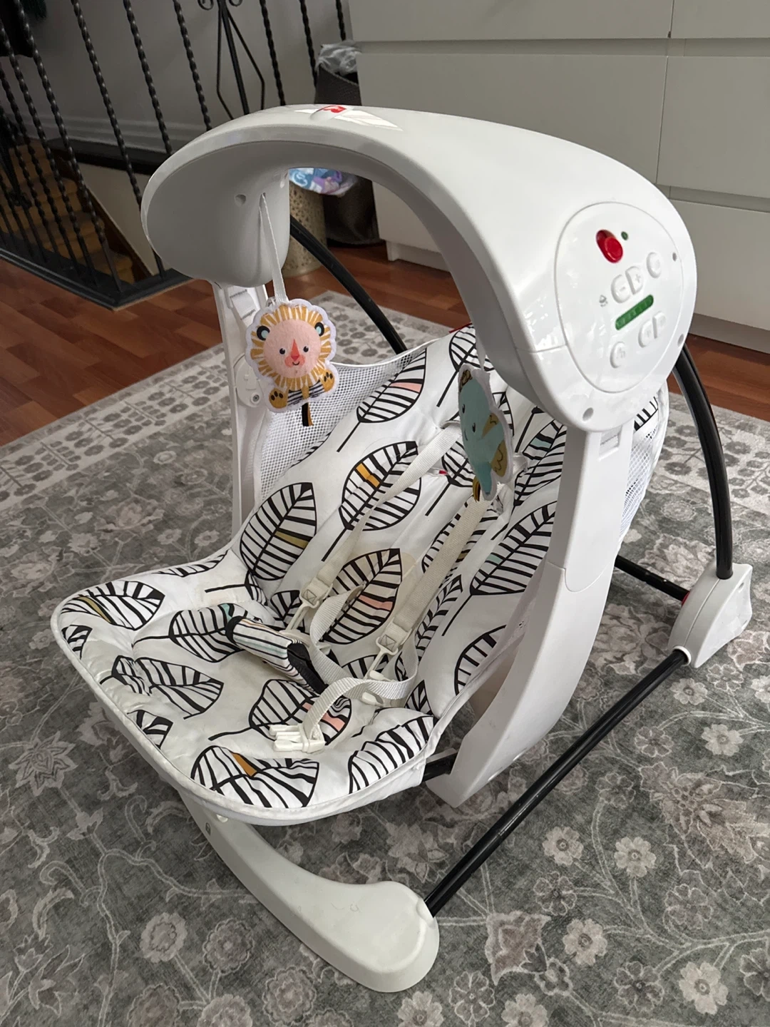 Fisher-Price baby swing with a cute leaf pattern on the seat. It has a mobile with hanging toys. Provides a comfortable and safe space for your baby.