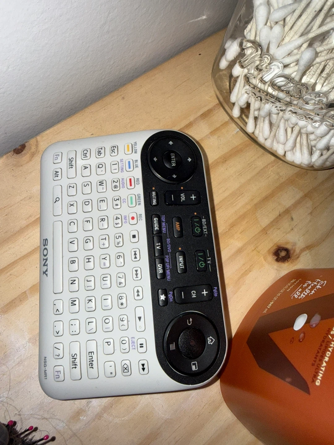This is a Sony NSG-MR1 wireless keyboard remote. It's a white remote with a full QWERTY keyboard layout and navigation buttons. It's perfect for controlling your Sony TV or media device!