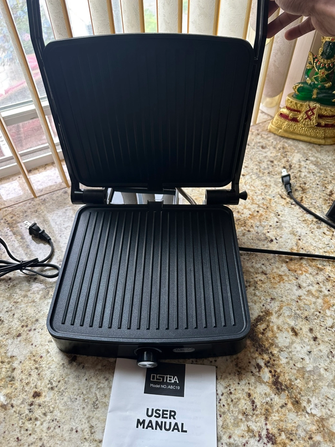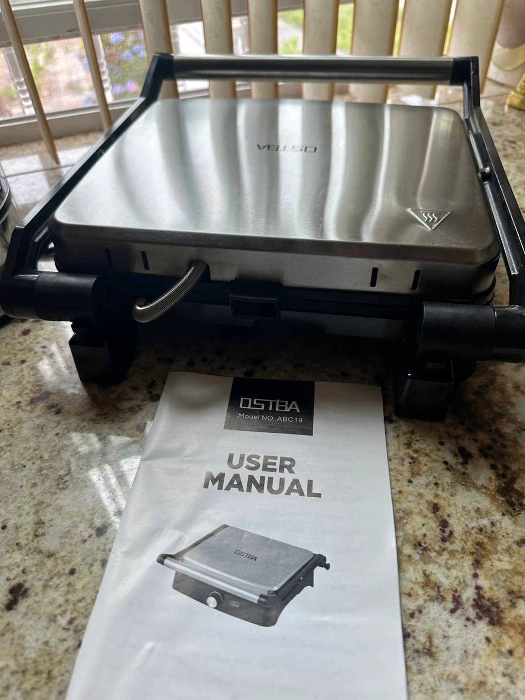Contact grill with a stainless steel top. The grill has a black base and a handle. Includes a user manual, as well. Enjoy your new grill and make some delicious meals.