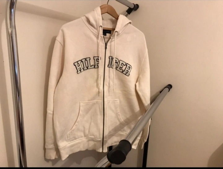 White zip-up hoodie with a large Hilfiger logo on the front and 2 Kangaroo pockets.