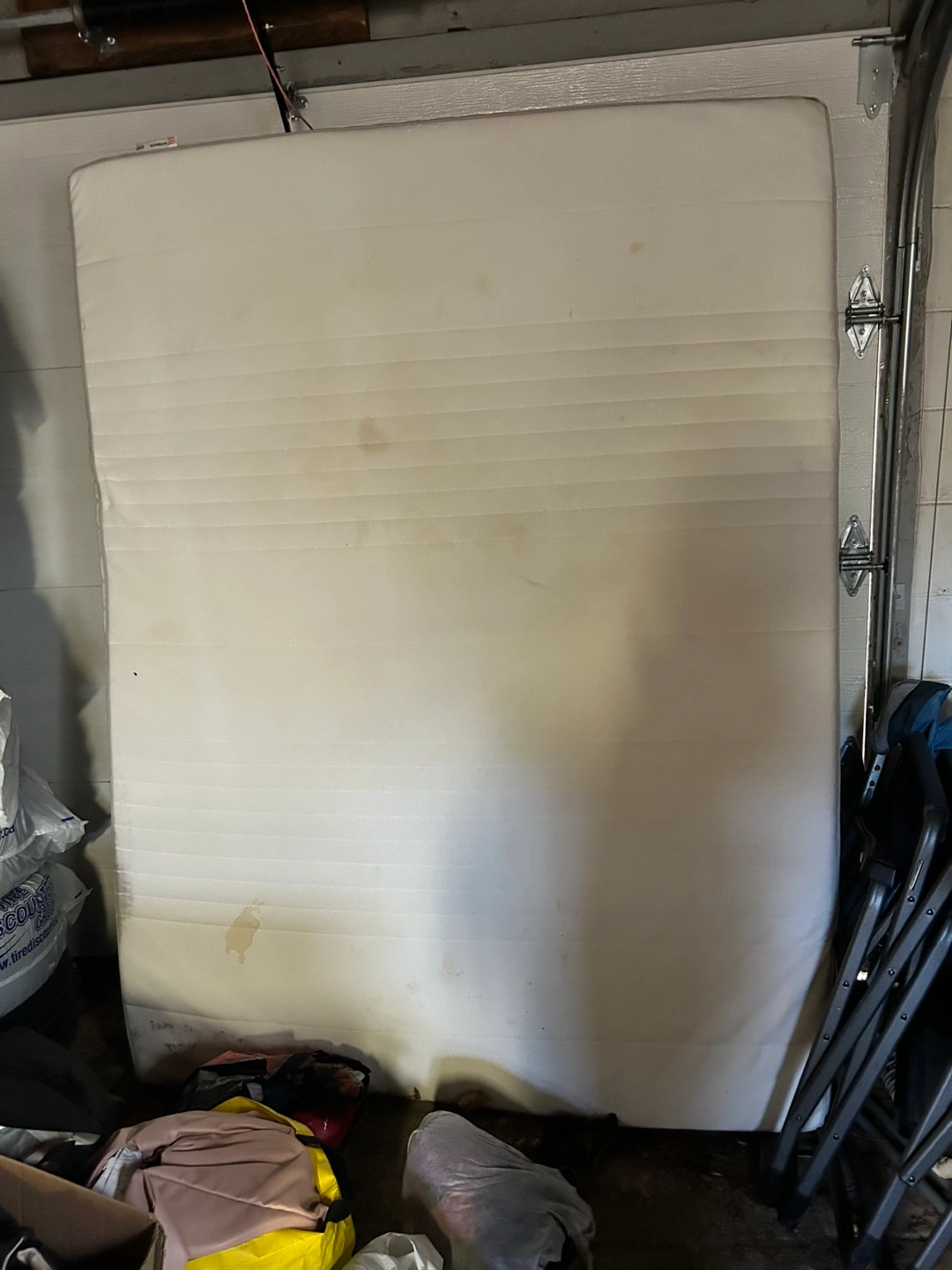 Queen size and firm. Very comfortable. Used by my adult child. Good condition but has some coffee stains, and minor dirt stains as it’s stored in garage. A good wipe and mattress protector will help.