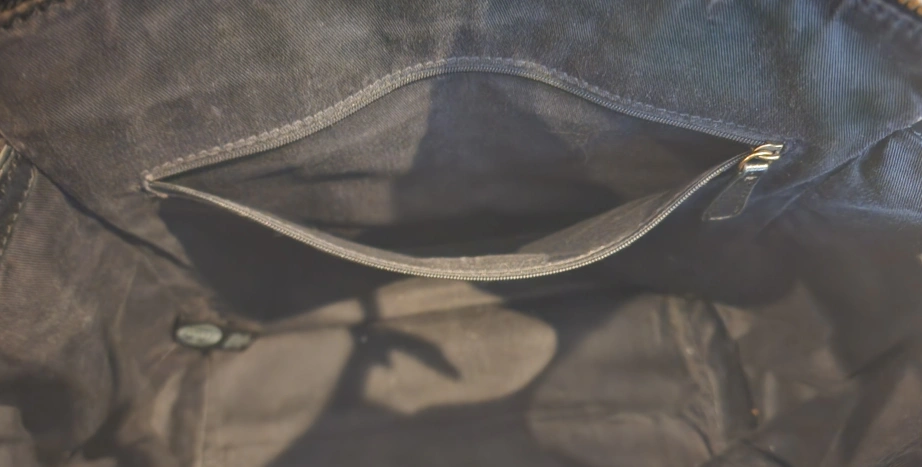 Black leather tote bag with gold hardware. Interior features a zippered pocket and a slip pocket.