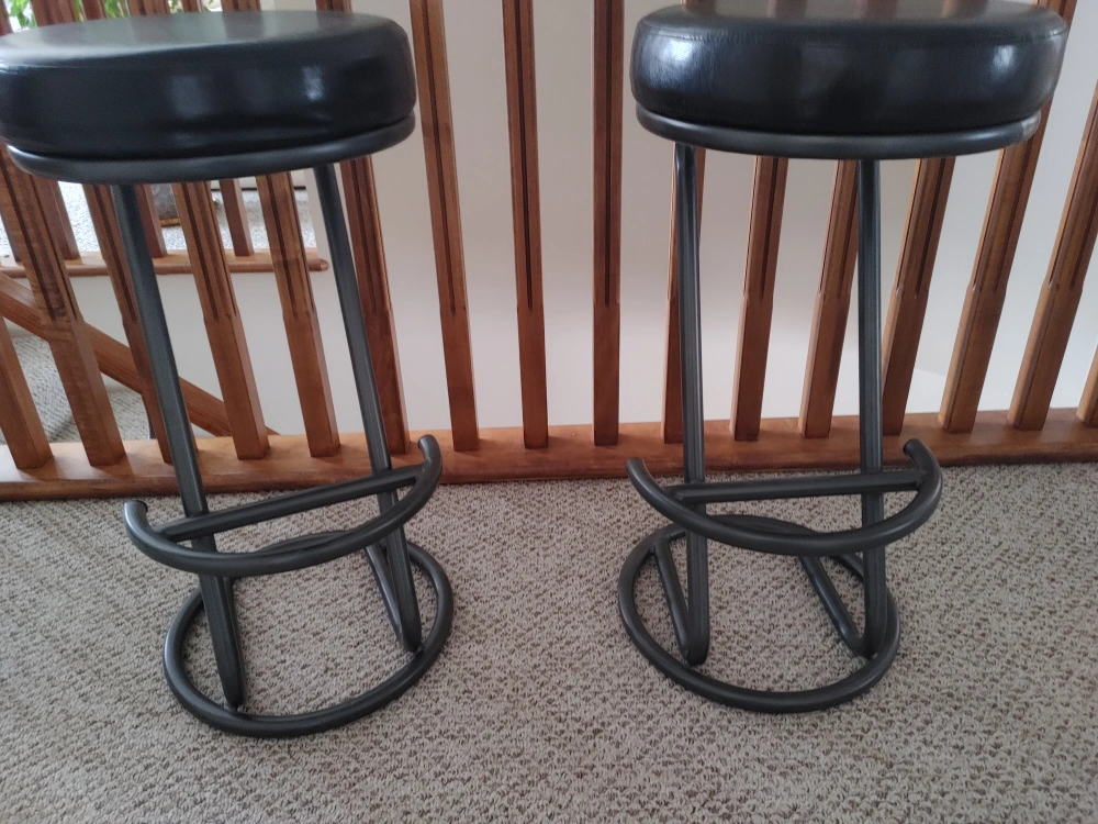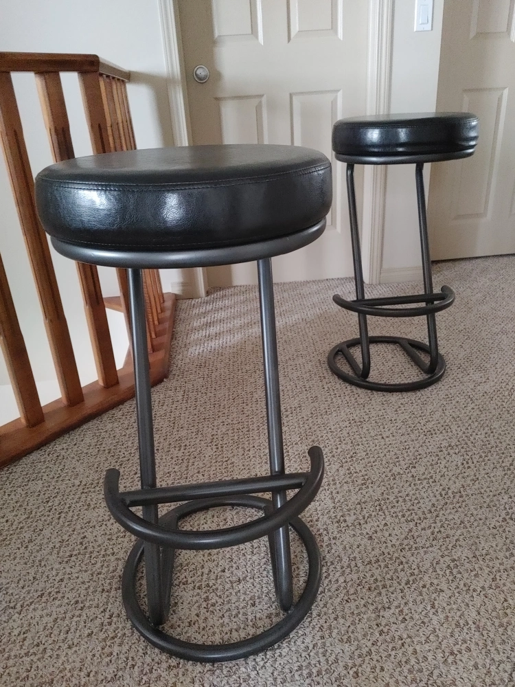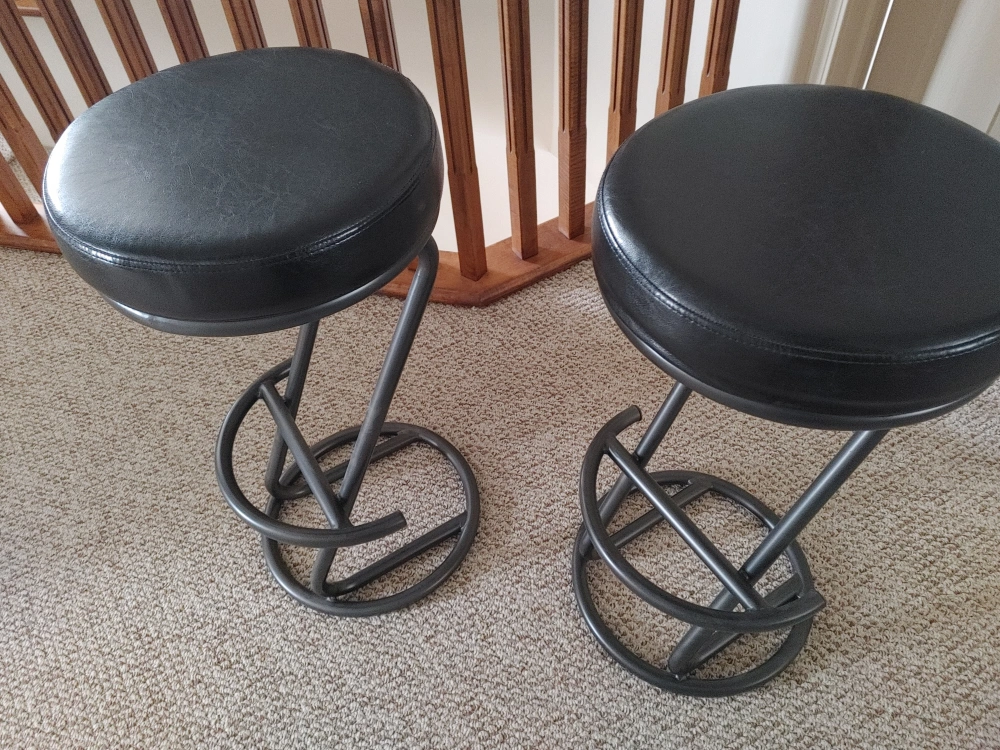 Unique design: Set of 2 black bar tall stools with black faux leather seats and black metal bases. Bought and brought from the US.