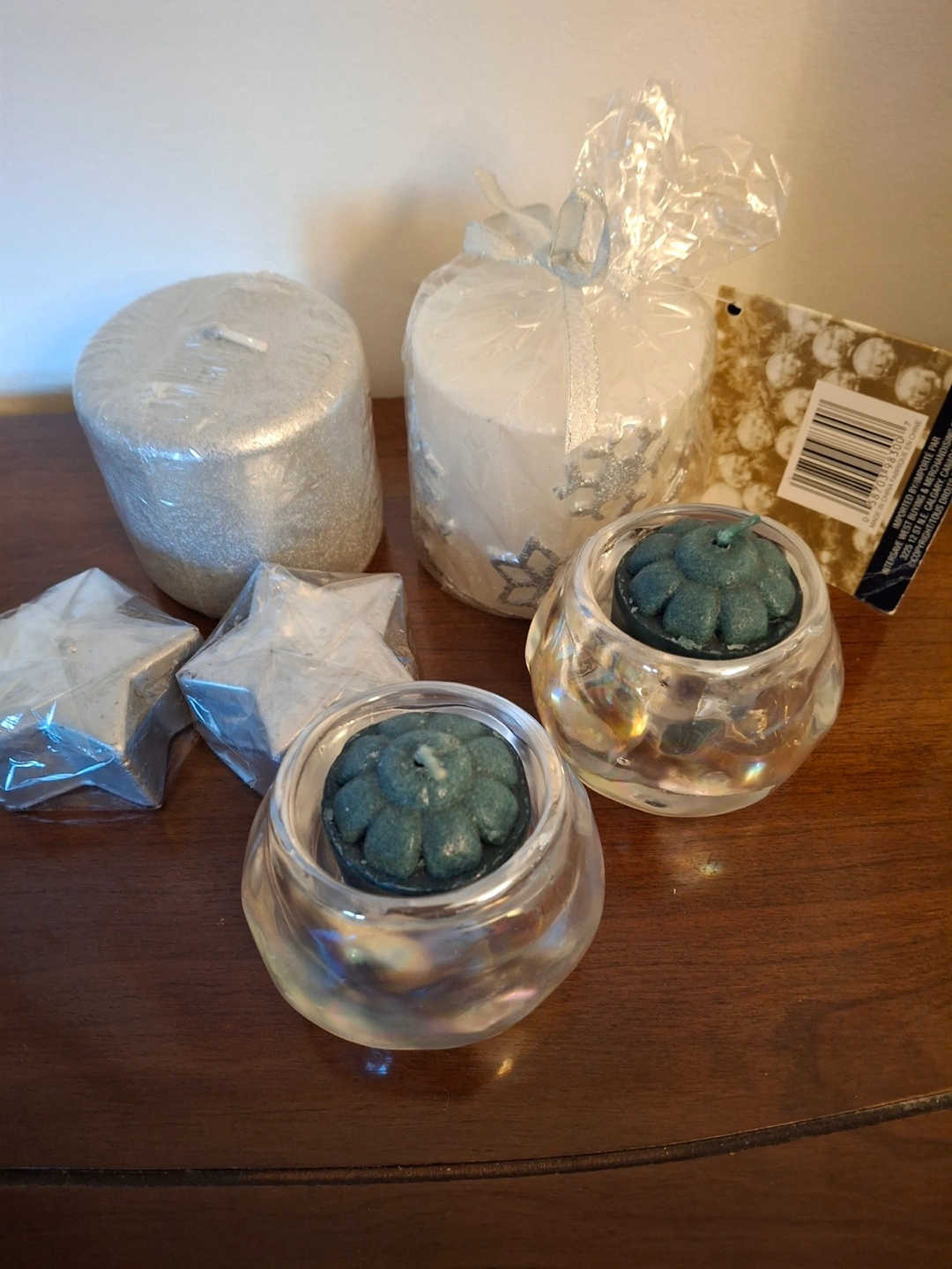 Includes a candle bundle with a plain silver wrapped candle 2.75” high, a wrapped grey candle with snowflakes 3” high, and 2 small silver star candles.