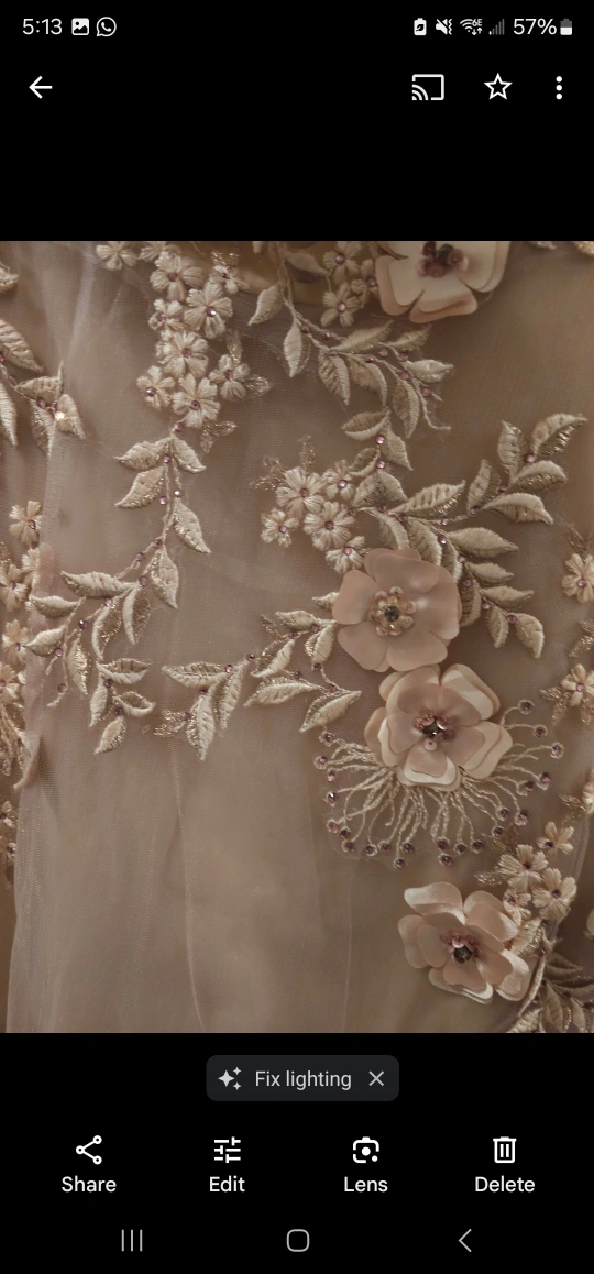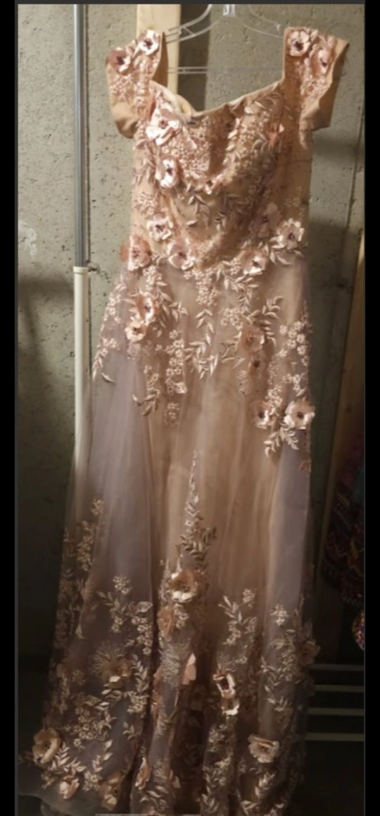 Beautiful, long, blush-coloured dress. Features delicate 3D floral embroidery and a tulle skirt. Off-the-shoulder style. Worn once for 5 hours.