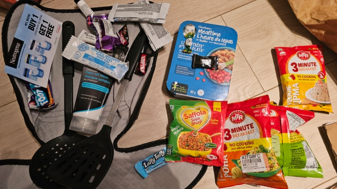 A collection of various food (Note that it's Past BB date) and beauty products, including a tube of face mask (cant find the BB date), two black kitchen utensils