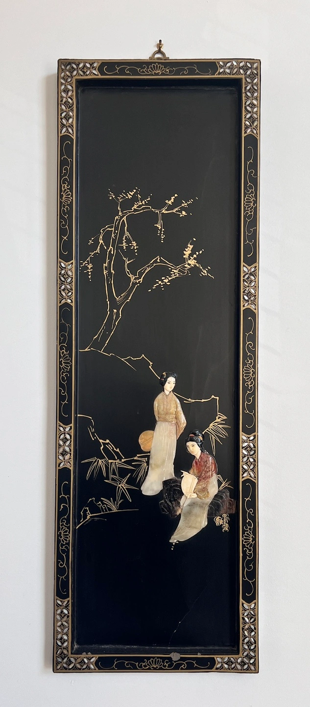 Vintage Black Lacquer & Jade Japanese Geishas Wall Art