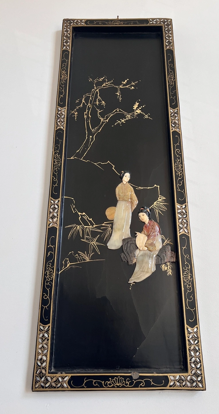 Artwork depicts two Geisha made of jade holding fans - one standing by the other sitting on a rock made of jade. Mother of Pearl inlay on frame. Gold painted details.