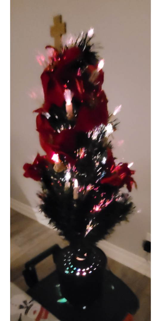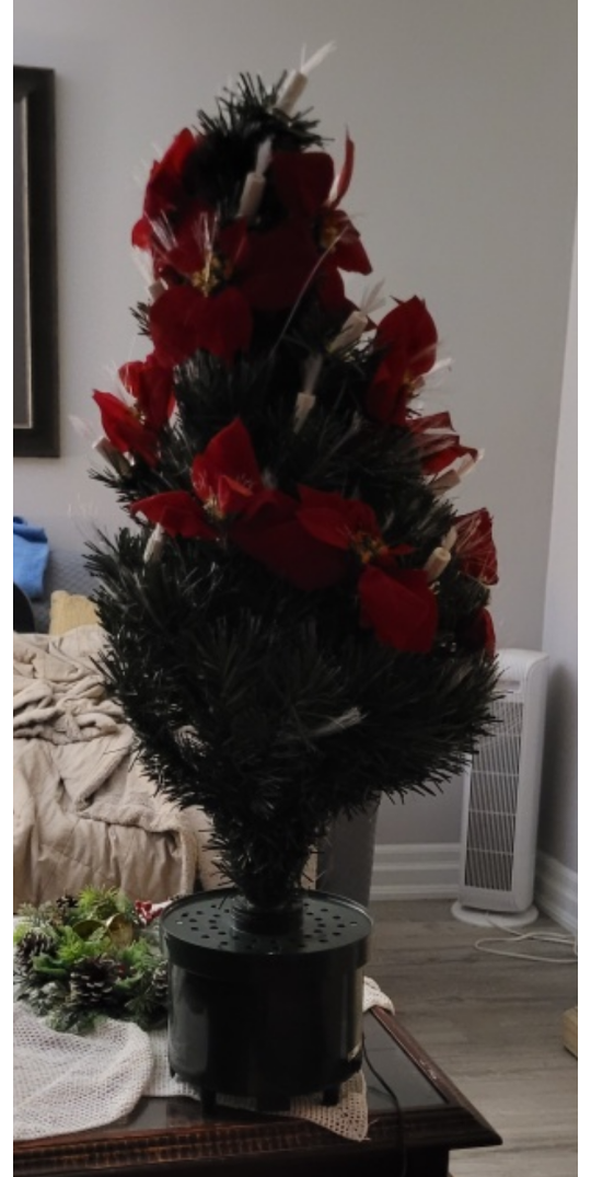 Small fibre optic Christmas tree. Lights up with a variety of colours. Comes with a black plastic base. approx. 3 feet tall