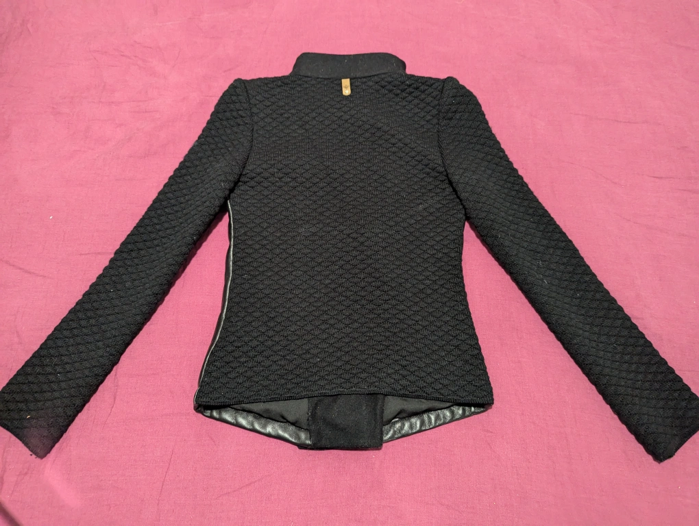 Black leather jacket with a quilted knit body and sleeves. Features an asymmetrical zipper closure and a collar that can be worn up or down. Small flaw on upper left sleeve, shown in pics. Price is reflective.
