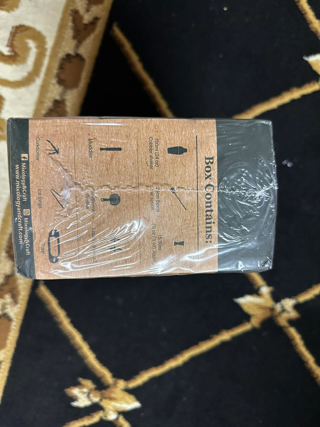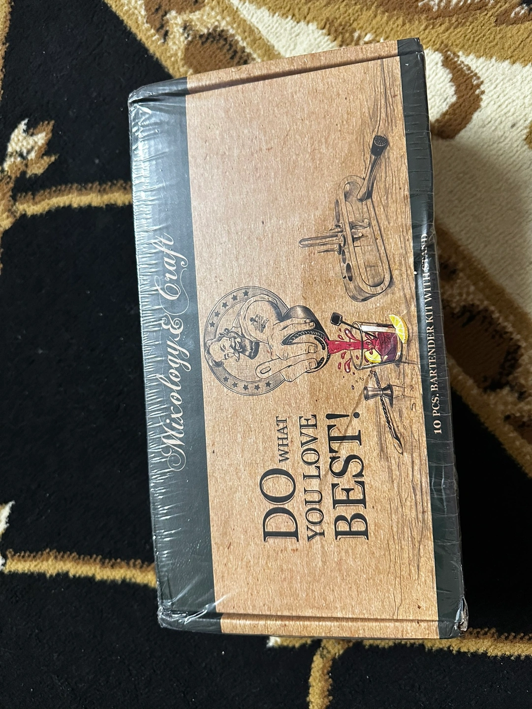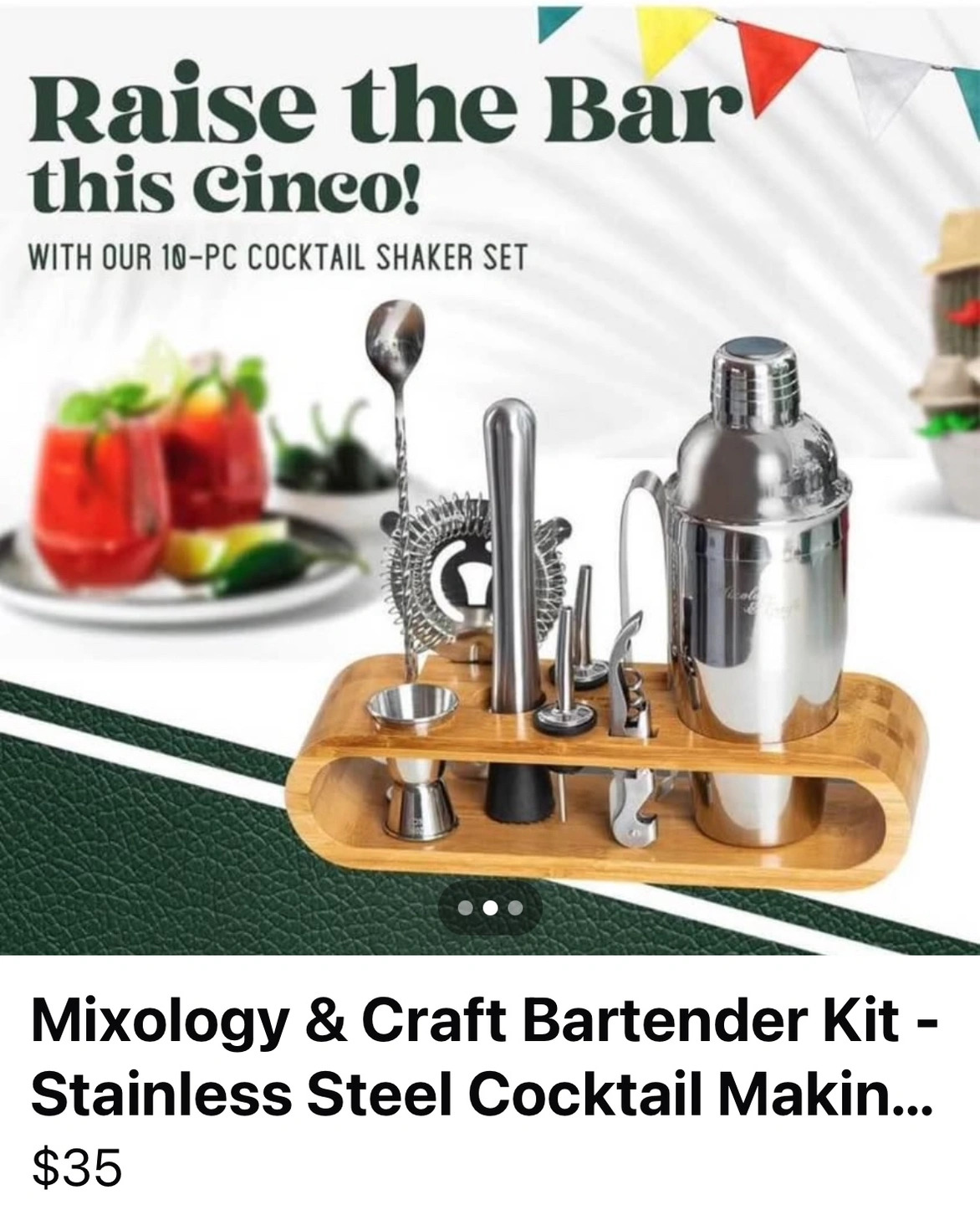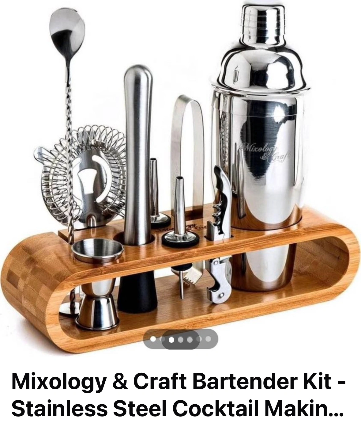 10-piece stainless steel cocktail making set, includes a cocktail shaker, muddler, jigger, bar spoon, bottle opener, ice tongs, and a bamboo stand.