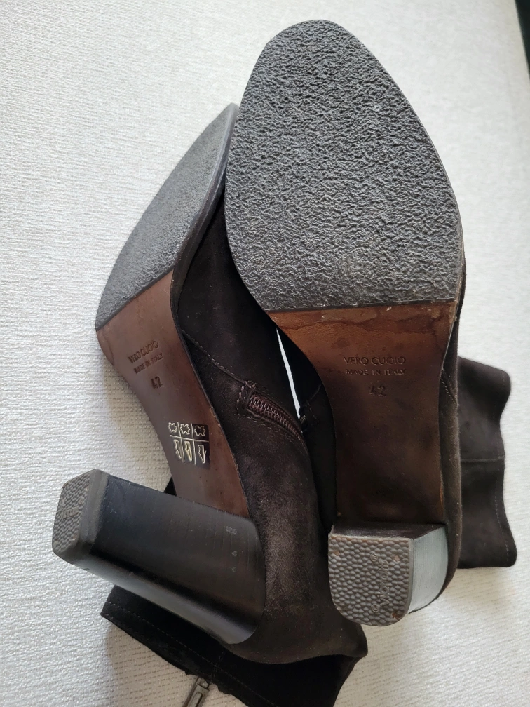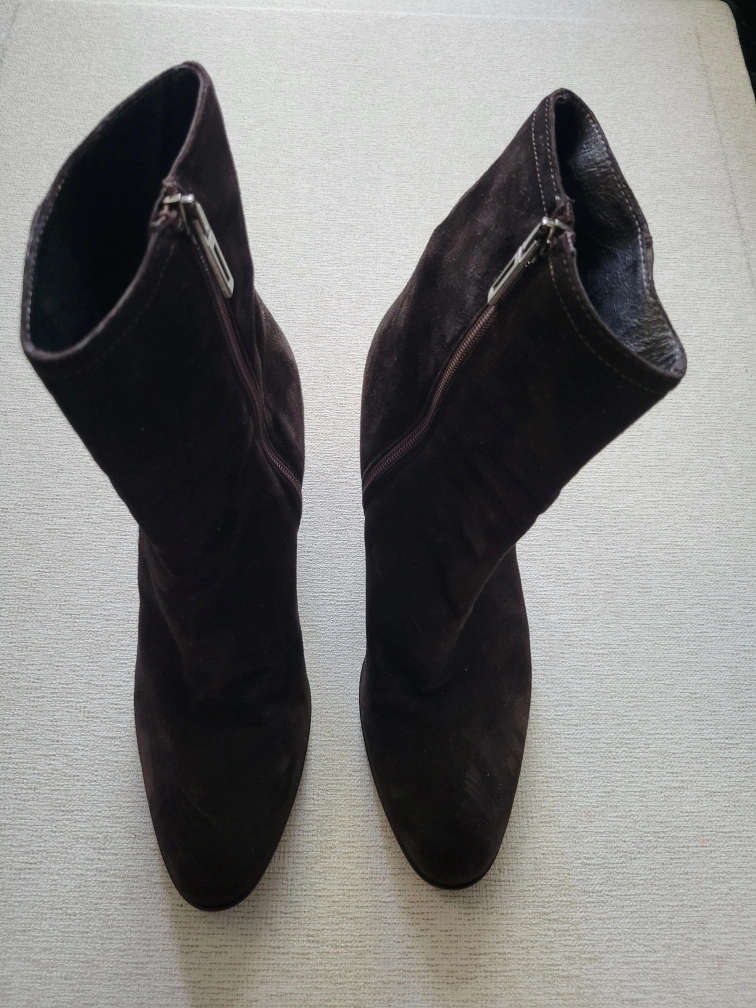 Brown suede ankle boots with a block heel and side zipper. Made in Italy.