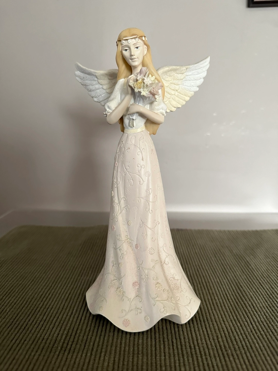 Angel figurine. White and pink with floral design. Holds a bouquet of flowers. The base reads "Believe" and "Angels Watching Over You."