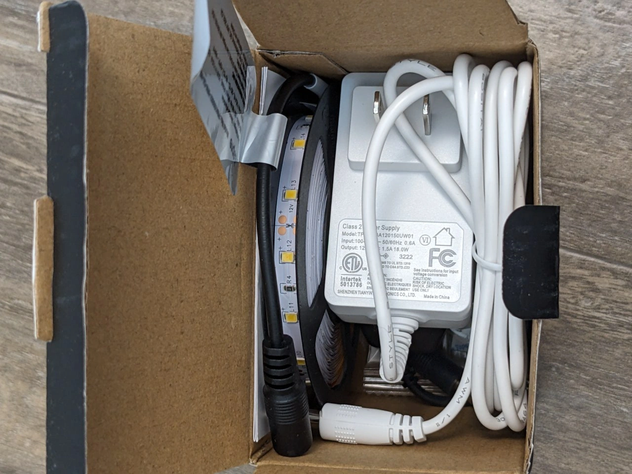 LED strip lights, 5 metres (16.4ft) long, warm white. Includes power adapter and connector.